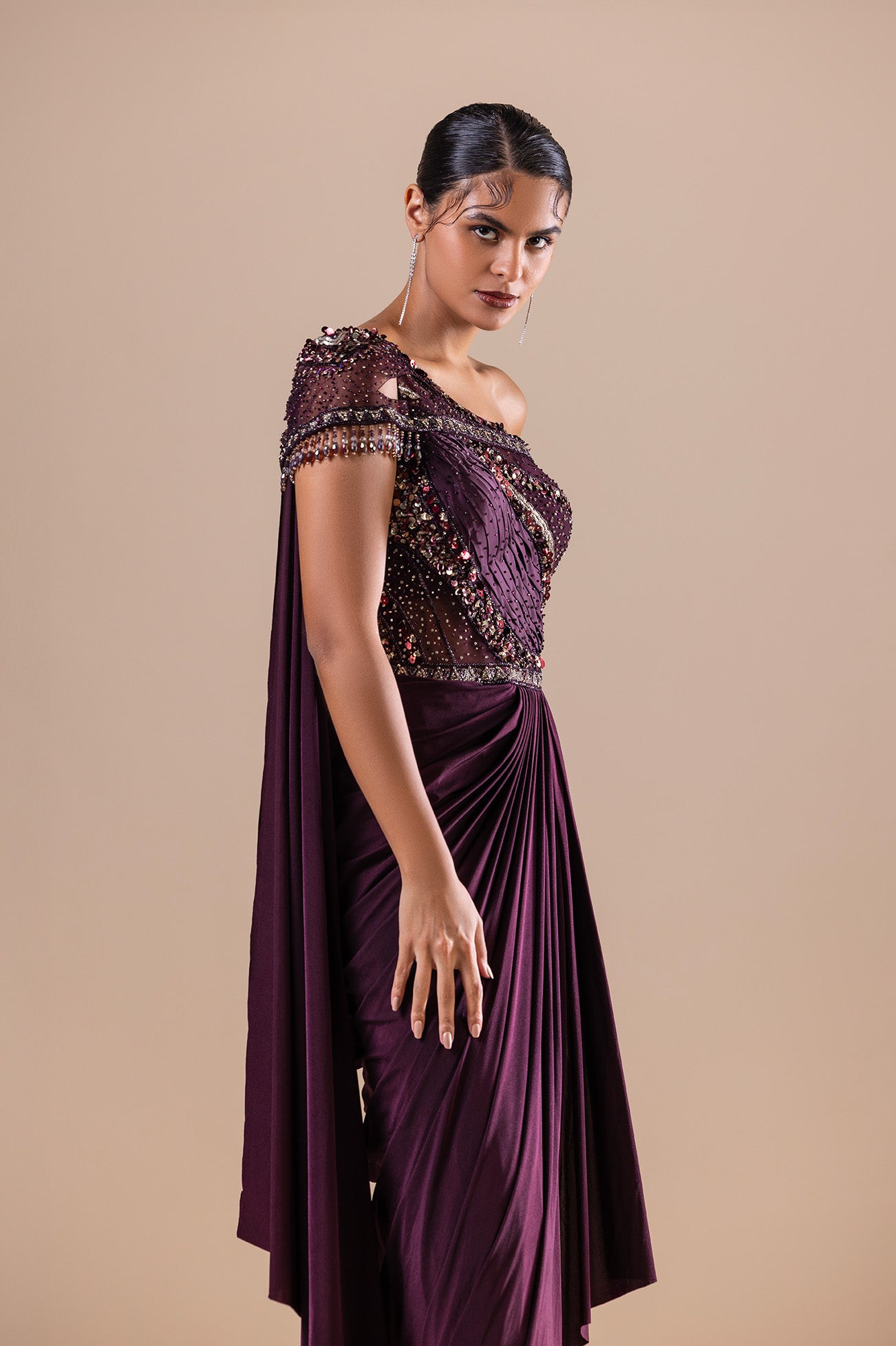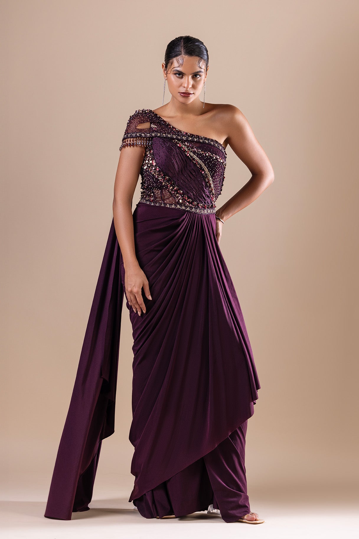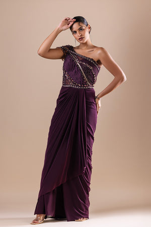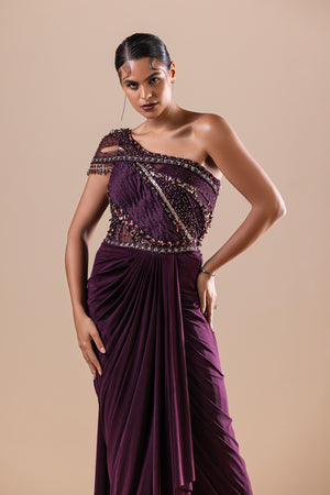 Burgundy lycra & Net draped saree gown with crystals, cut dana and sequins hand embroidery.