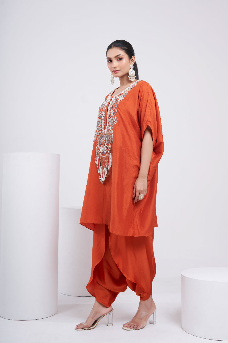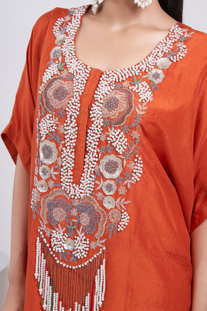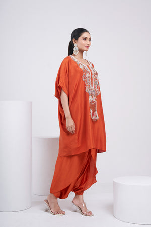 Rooted in artisanal grace, this kaftan set is a celebration of effortless elegance. Rendered in a bold rust hue, the fluid silhouette features a hand-embroidered neckline intricate detailing that mimics tribal heirlooms and festive charm. Paired with soft draped tulip pants, this set bridges ease with extravagance—ideal for sundowner soirées, festive brunches, or statement celebrations.