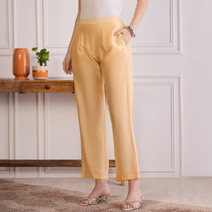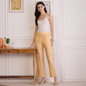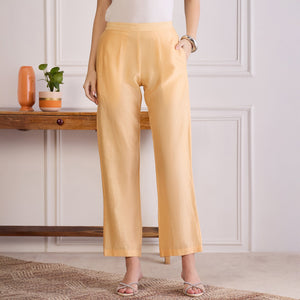 Style Guide Pair these straight pants with a tailored kurta, crisp shirt, or a flowy tunic to create a balanced, polished look. For cooler days, layer with a longline shrug or a structured blazer for added sophistication. Footwear options like block heels, mules, or embellished flats will complement the clean silhouette while keeping it versatile. Keep accessories minimal yet refined—think delicate earrings or a sleek watch to enhance the overall ensemble. Finish with a tote for workdays or a clutch for evenings out, ensuring a look that’s both effortless and elegant.