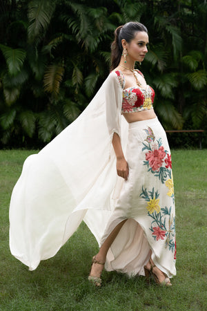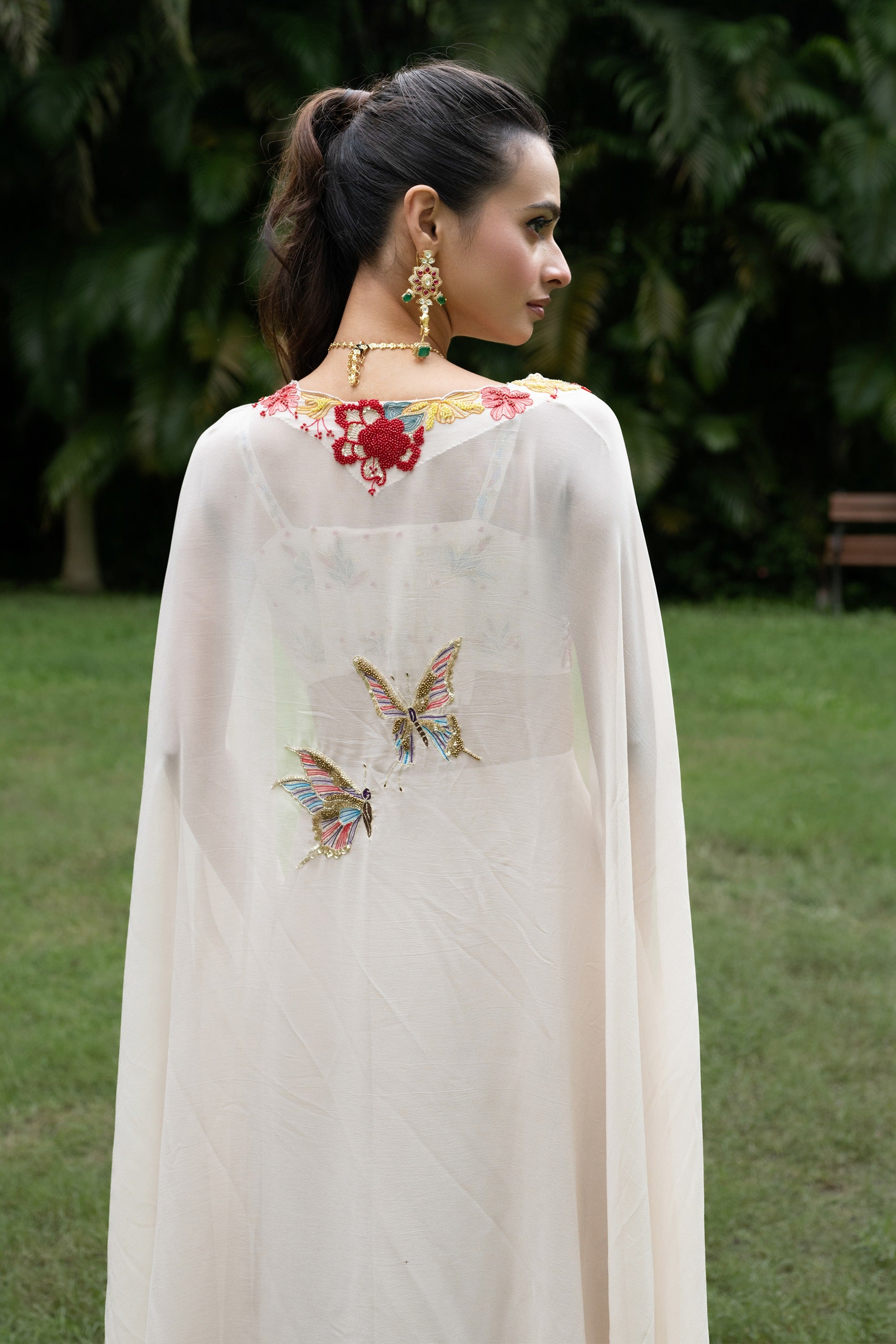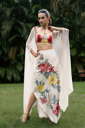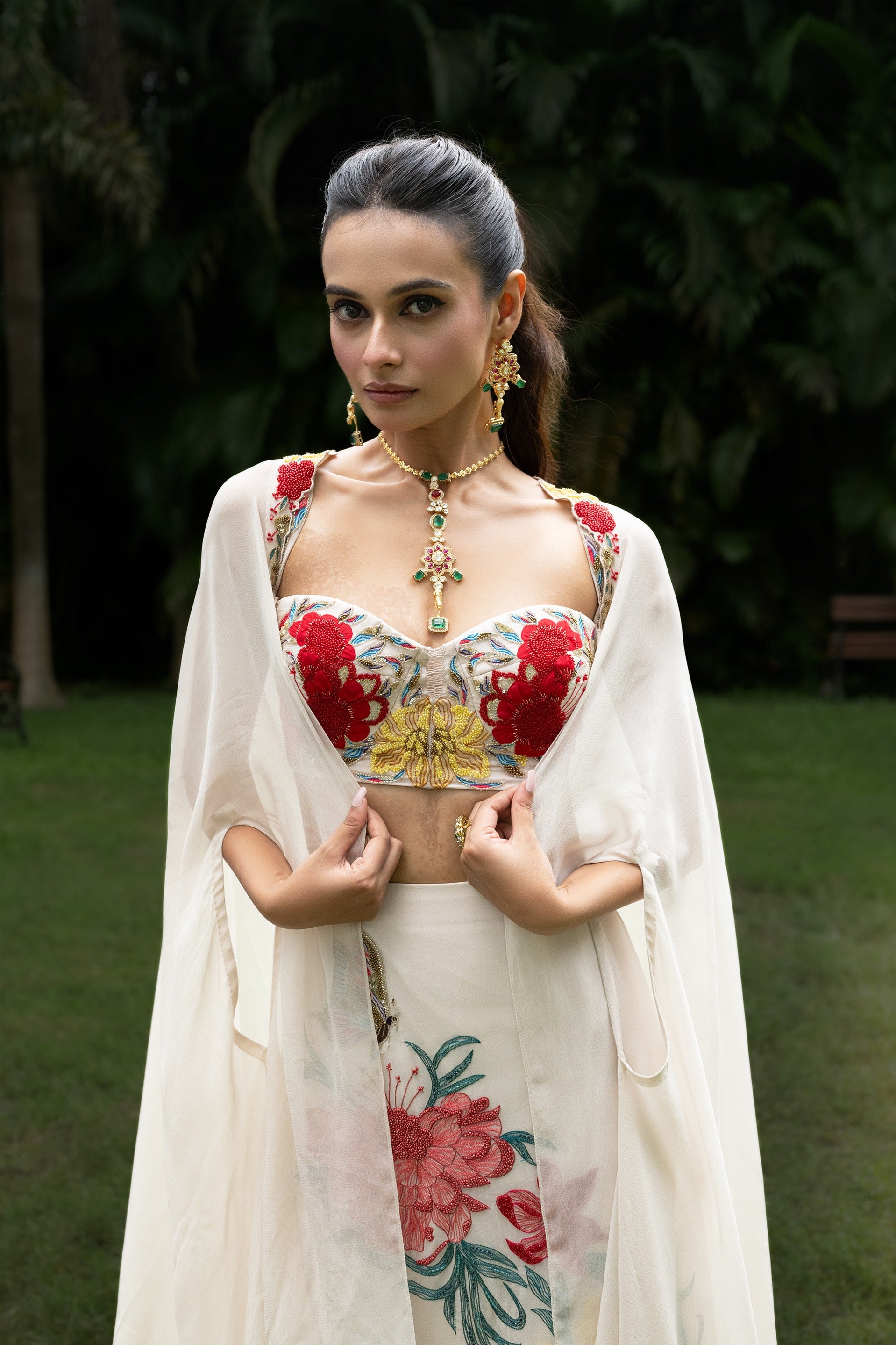 The ensemble features a delicate corset top in viscose organza, paired with a graceful georgette skirt lined with taffeta for a refined drape, and finished with a flowing cape in viscose organza, all beautifully adorned with intricate floral and butterfly embroidery that adds a touch of timeless elegance.