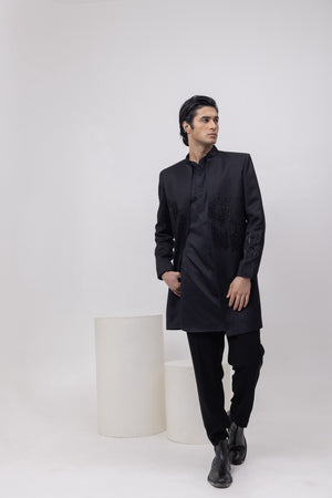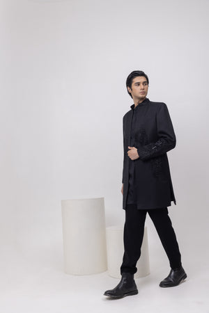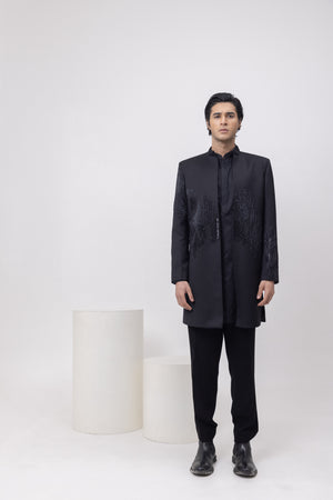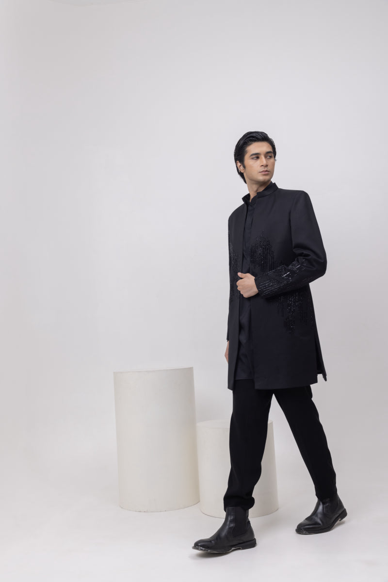 An all-black open jacket set with kurta and pants, elevated by linear embellishments that catch the light with every move. Sleek, minimal, and made for modern festive nights or cocktail receptions. Understated! Unmissable!
