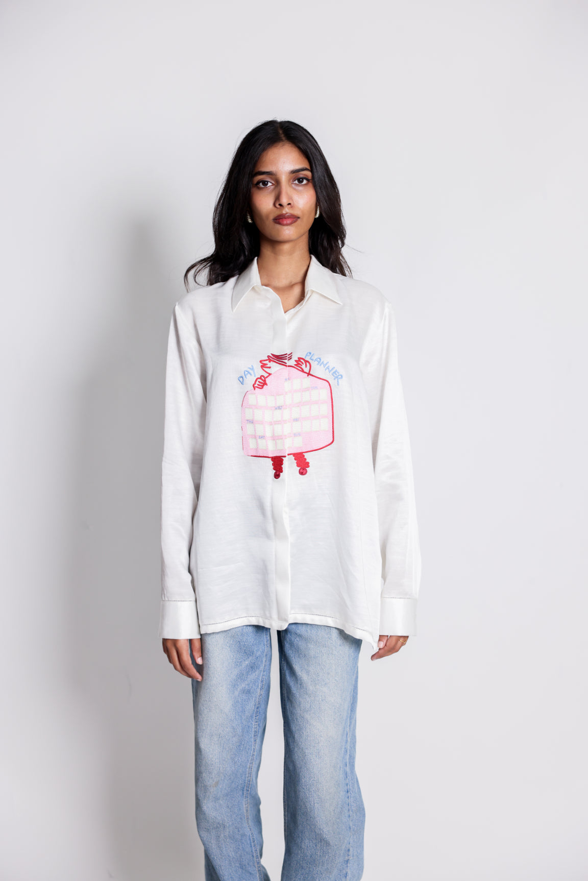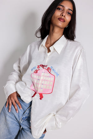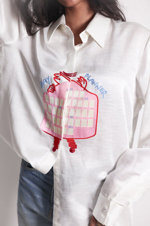 You'Re Not Alone, We All Forget The Day Of The Week. The Calendar Shirt Is A Playful Linen Satin Shirt With A Funny Figure Weekly Calendar Hand-Embroidered Across The Front. Customized With A Removable Funny Figure Pin To Attach On The Day You'Re Wearing It.
