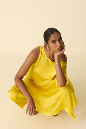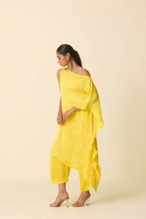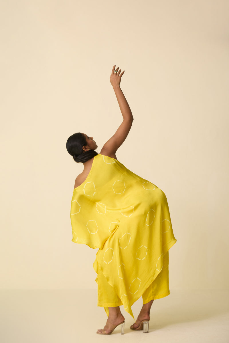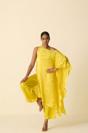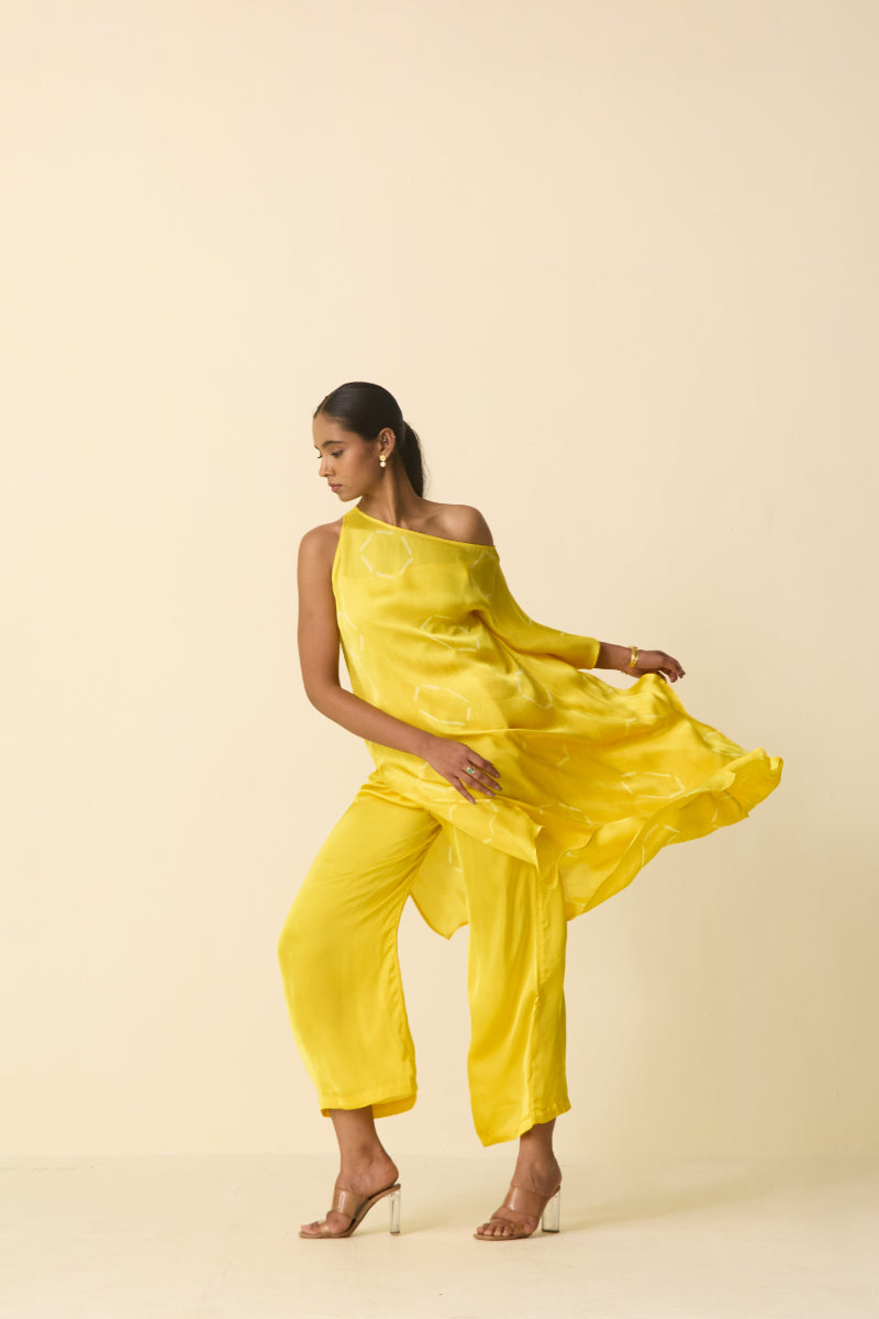 Embrace effortless elegance with the Canary Co-ord Set. Made from lightweight Habutai silk, this breezy ensemble is designed for all-day comfort. The one-shoulder kaftan top, adorned with subtle white hexagon prints, falls beautifully, while the relaxed-fit pants offer an easy laid-back feel. Airy, flowy, and summer-ready vibrant yellow set is perfect for sun-soaked vacations, beachside brunches, or leisurely strolls under the sky.