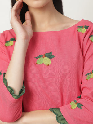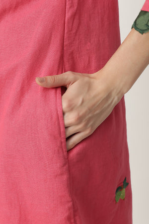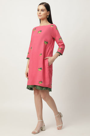 Pink colour boat neck short embroidered dress with deep green chanderi attached slip with scallop hemline detailing