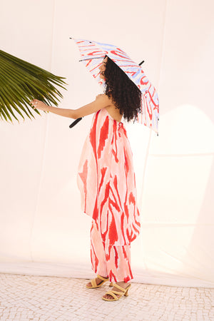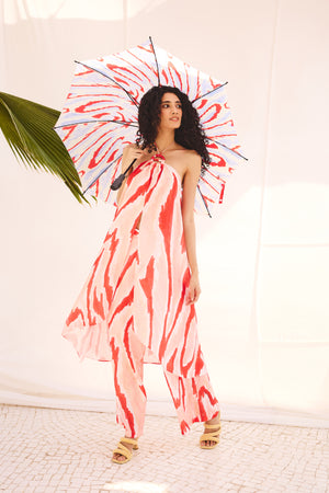 This co-ord set features a calf-length top with thin straps positioned at the center above the
