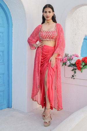 This Georgette Cape Set Has Mirror Hand-Embroidered Blouse, With A Graceful Pearl Drop Down, Beautifully Paired With A Ruched Skirt, Completing The Style With A Printed Cape, Adorned With Lace Edging And A Chic Tie-Up.