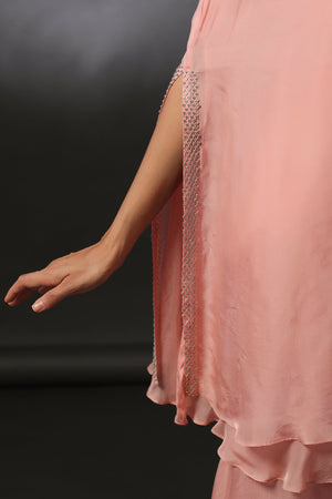 Salmon Pink Cape with rhinestone detailing in the yoke paired with a bustier and Flared pants in Flat Chiffon.