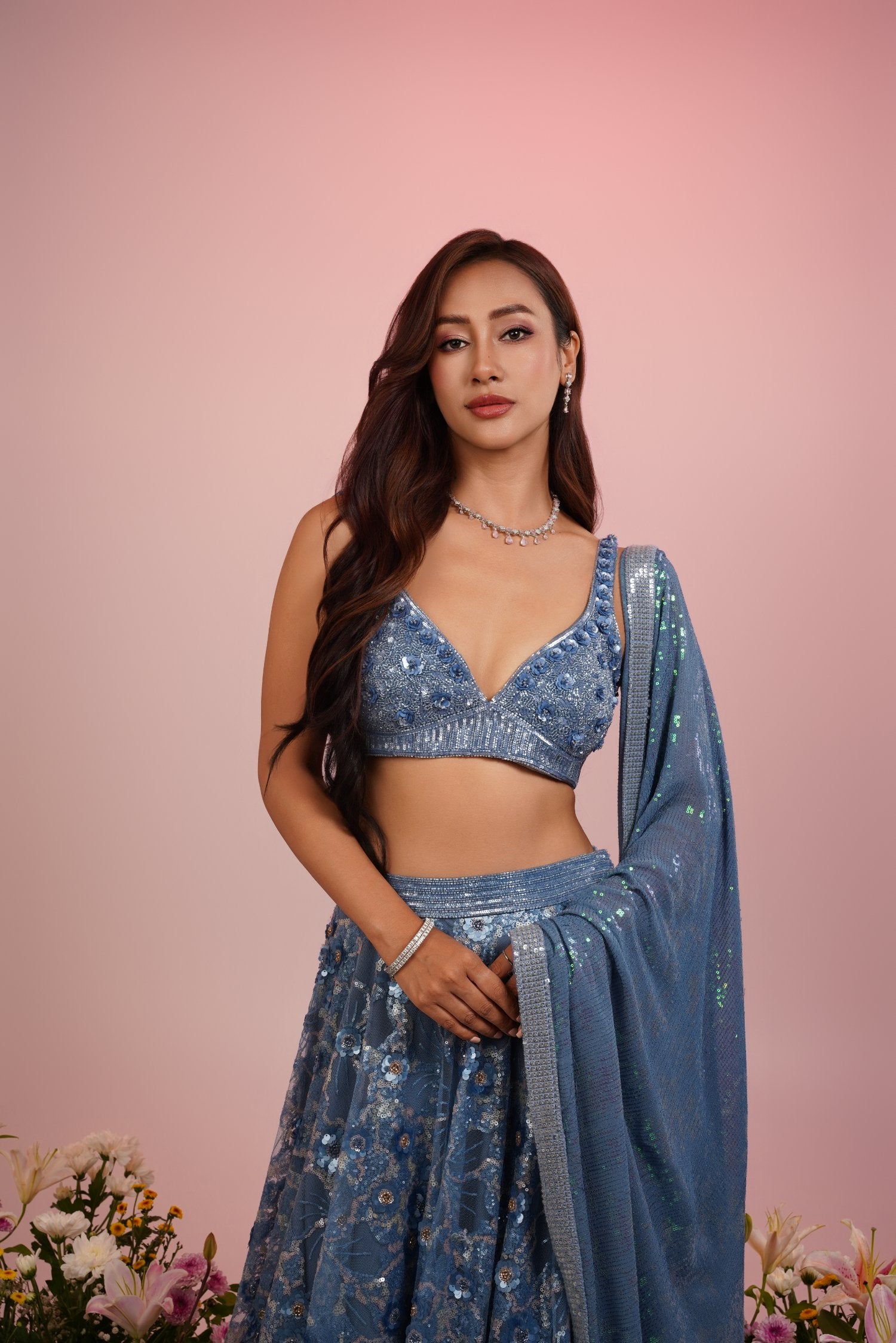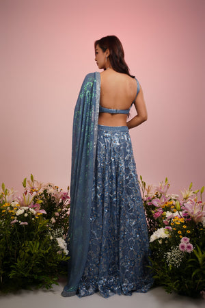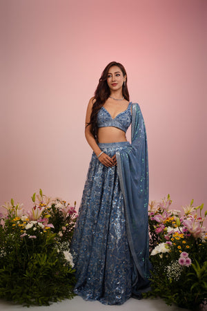 Carbon blue embroidered lehenga set with hand embroidered blouse complete the ensemble added with matching embellished Georgette dupatta
