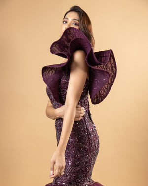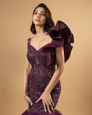 Featuring Caroline Burgundy Fish cut Gown handcrafted using stem jaal with net and hard net. It is hand embroidered using crystals and cut dana work