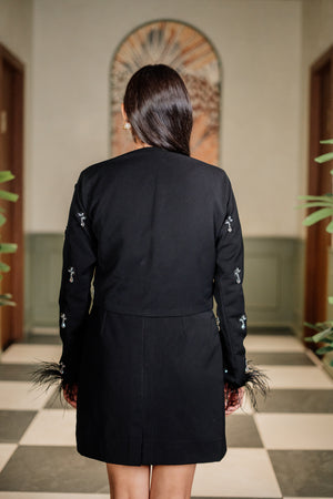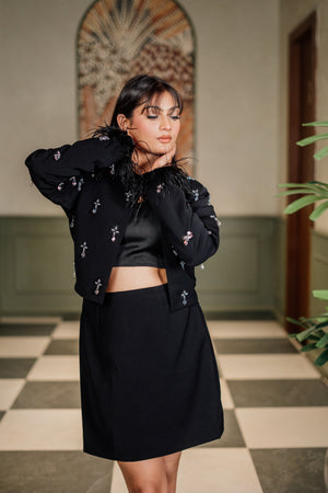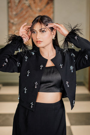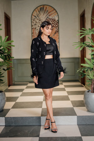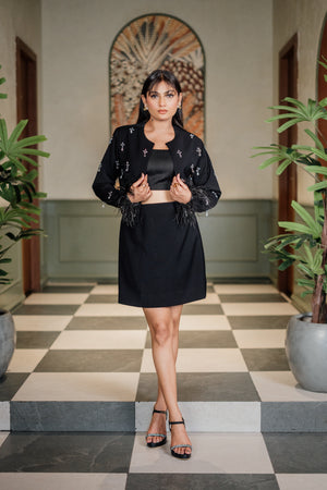 This all-black co-ord features a sleek cropped top paired with a mini skirt that highlights your silhouette with understated elegance. The real showstopper? A cropped jacket adorned with delicate silver embellishments and playful feather accents at the cuffs — adding glamour and movement with every gesture. Finished with subtle shoulder padding for structure and sparkle-studded detailing, this look is made for those who command attention without saying a word.
