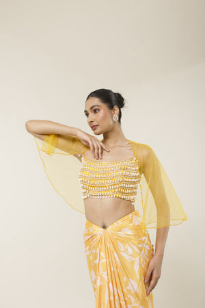 A noodle strap blouse hand embroidered with pearls and katdana paired with dhoti skirt so easy breezy to carry. Comes with a short detachable cape in net with pearl detailing on it!