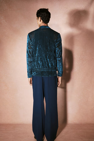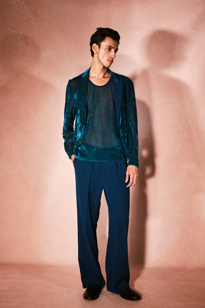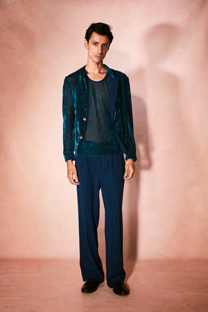 A midnight blue three-piece that redefines evening menswear. A sheer mesh tunic slips beneath a precision-cut velvet blazer, grounded with tailored trousers. The look strikes the perfect balance of structure and sensuality, luxury dressing for nights that call for presence and power.