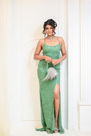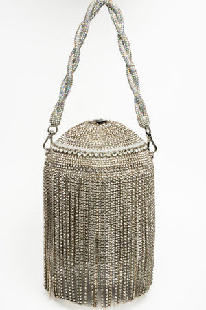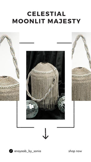 An incredible silver potli decorated with Diamantes all over and a little lock on the top, making it a convenient and fashionable addition to any outfit.
