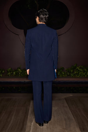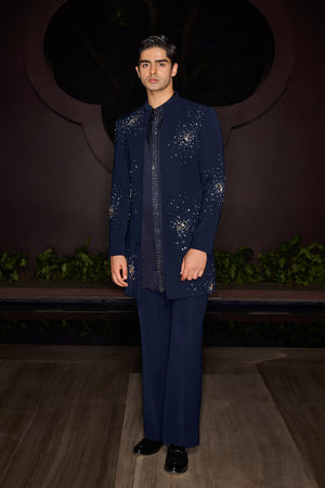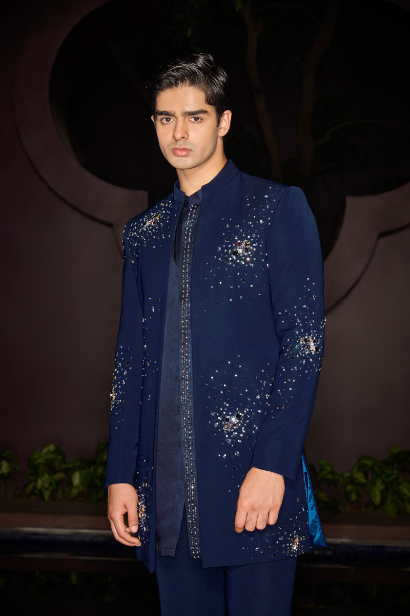 Embellished open sherwani set, adorned with vibrant stones and crstal work, paired with embroidered kurta and pants