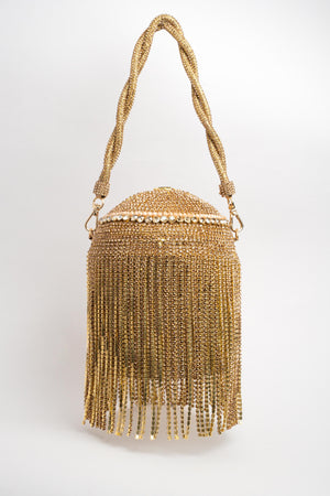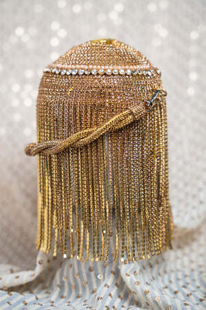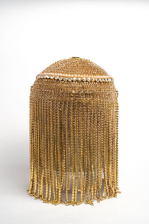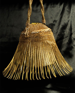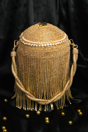 An incredible Gold potli decorated with Diamantes all over and a little lock on the top, making it a convenient and fashionable addition to any outfit.