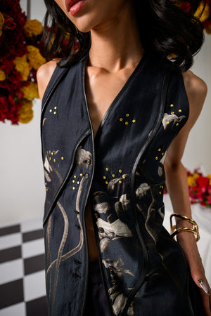Turn up the drama with the Gilded Midnight Waistcoat, where vintage meets vanguard. Crafted in premium black Chanderi, this waistcoat flaunts a floral vintage print with incut shoulders that bring a sharp edge. The abstract wavy leather binding glides across the front and hems, while miniature golden studs add just the right touch of midnight glamour.