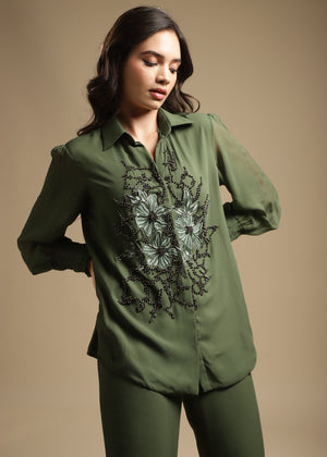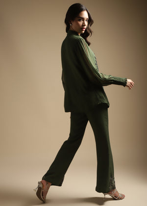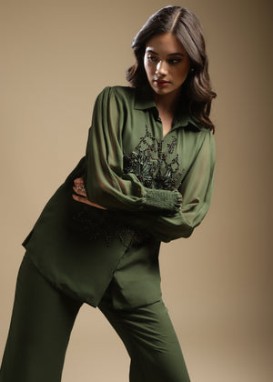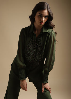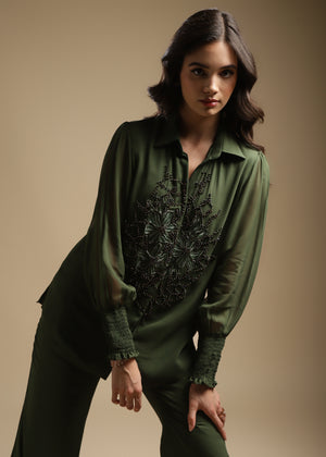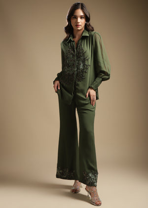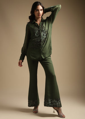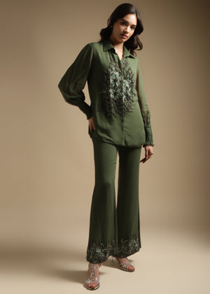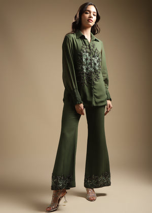 Shirt With Intricate Embroidery On Centre Of The Shirt With Thin Collar And Elasticated Cuffs. Paired With Embroidered Bell Bottom Pants.