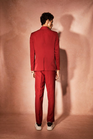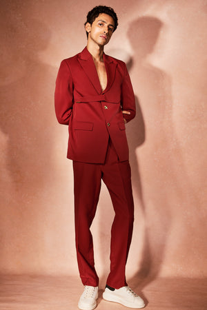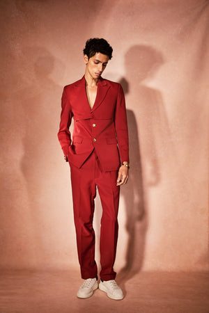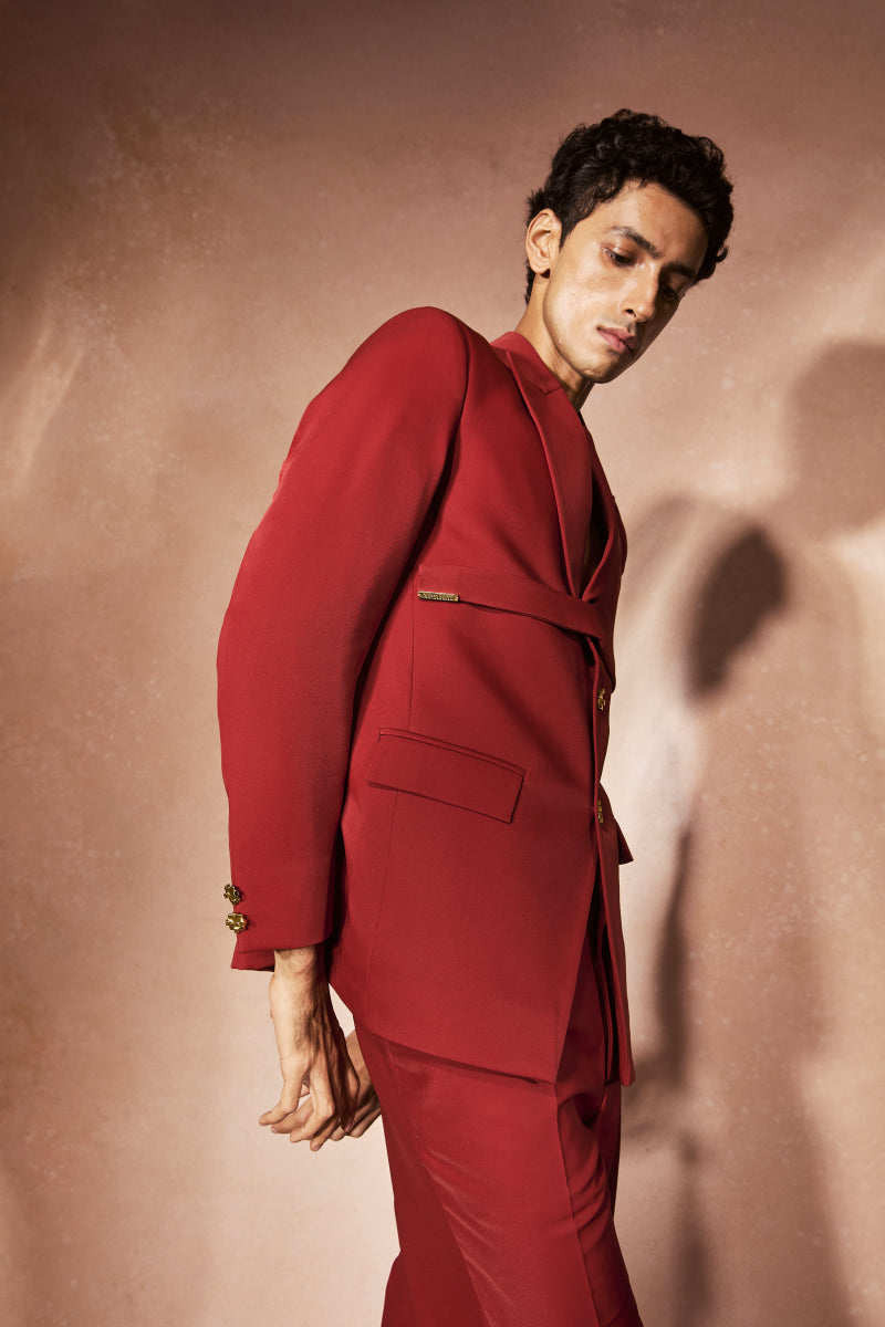 A striking flame-orange co-ord that redefines ceremonial dressing. The tailored blazer, detailed with sharp flap accents, pairs seamlessly with straight-leg trousers in the same bold hue. This set channels power and precision through a contemporary lens, crafted for festive occasions, statement nights, and new-age celebrations.