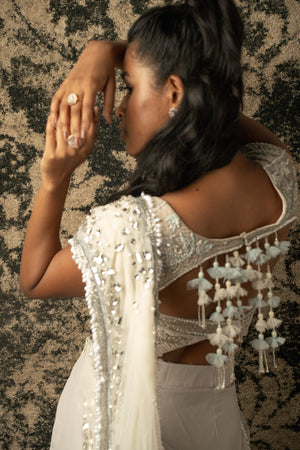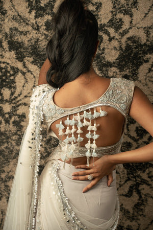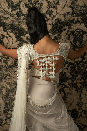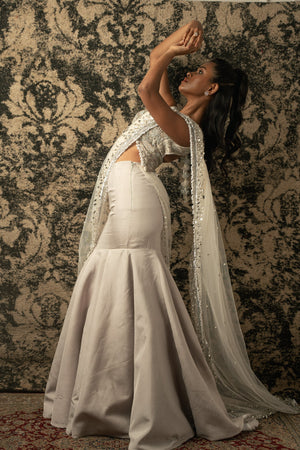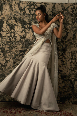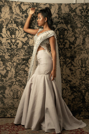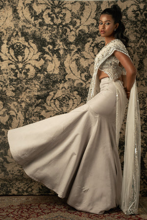 Fabric: Drape Saree- Net, Blouse- Velevet, Skirt- Habutai Silk