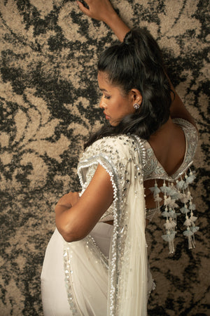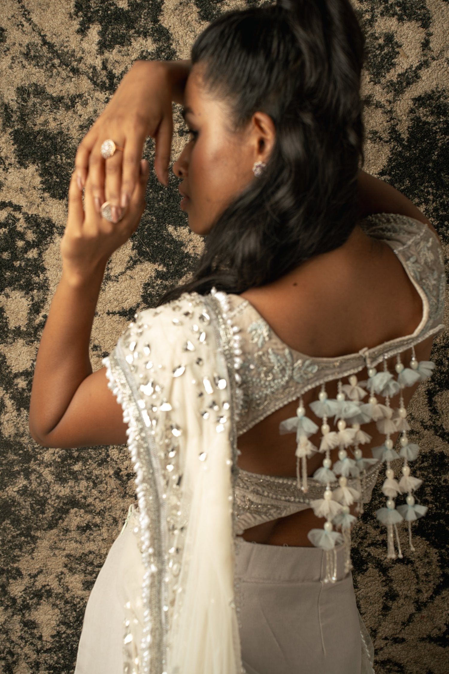Made with the finest silk and velvet this predraped saree is a concotion of gorgeous paired with a festive elegance. Its perfect fir a bride and a bridesmaid. This saree is a perfect blend of east meets west.