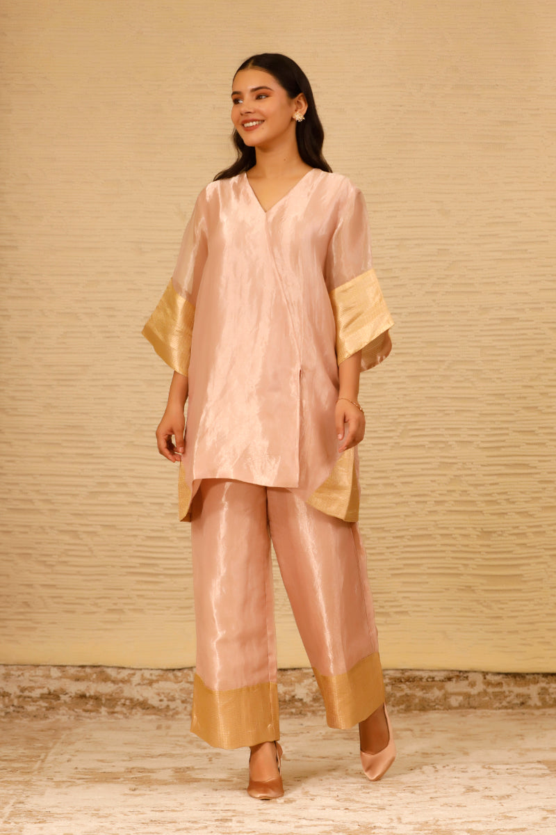 This ensemble includes a straight, short kurta paired with high-waisted pants. Subtle golden brocade patches lend a touch of understated glamour. Designed for a relaxed fit.