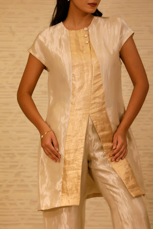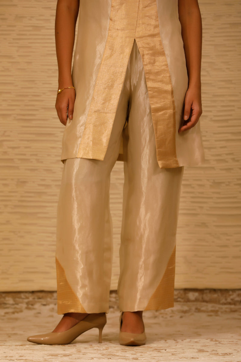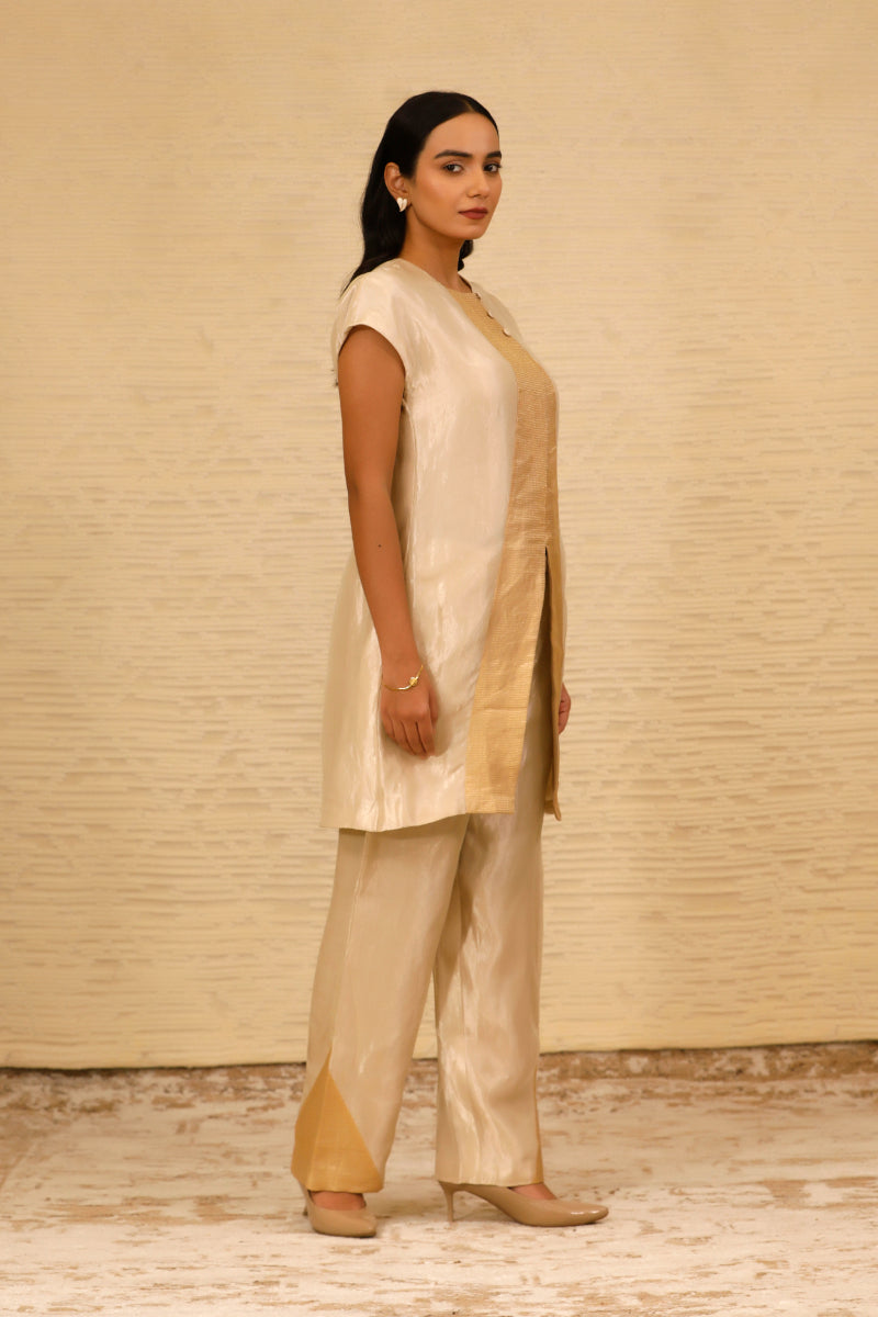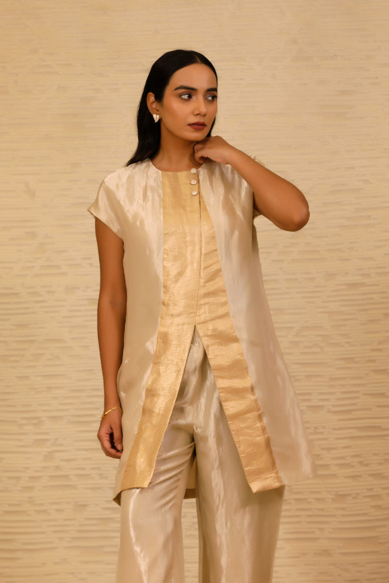 The ensemble features a straight, short silk tissue kurta with stylish drop shoulders and a sleek crew neck. Highlighting the kurta is a golden patch on the front placket, adding a touch of glamour. The sleeveless design enhances its contemporary appeal.