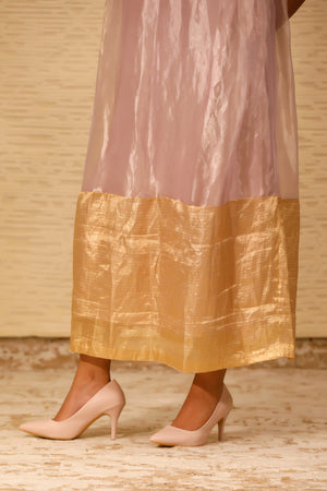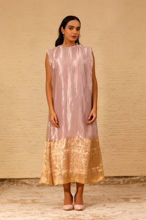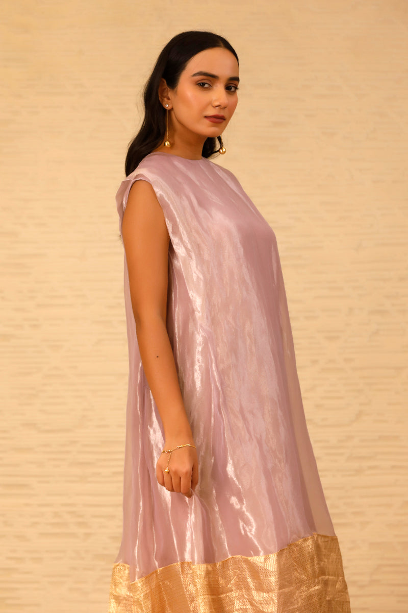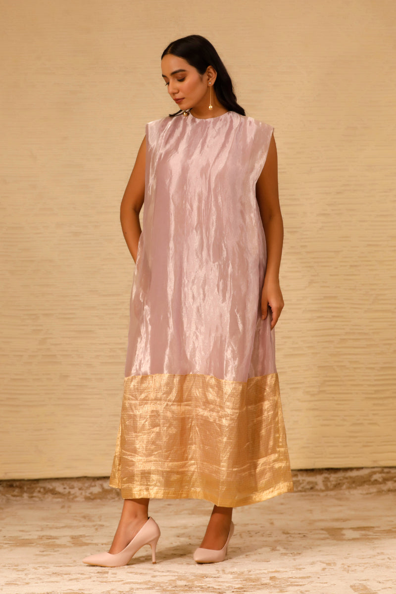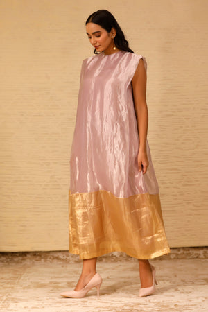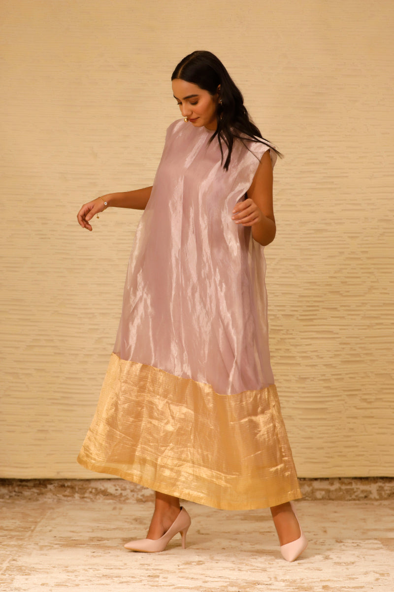 A chic dress featuring shoulder pleats and a rich brocade tissue patch. This ankle-length, sleeveless silk tissue dress embodies elegance and sophistication.