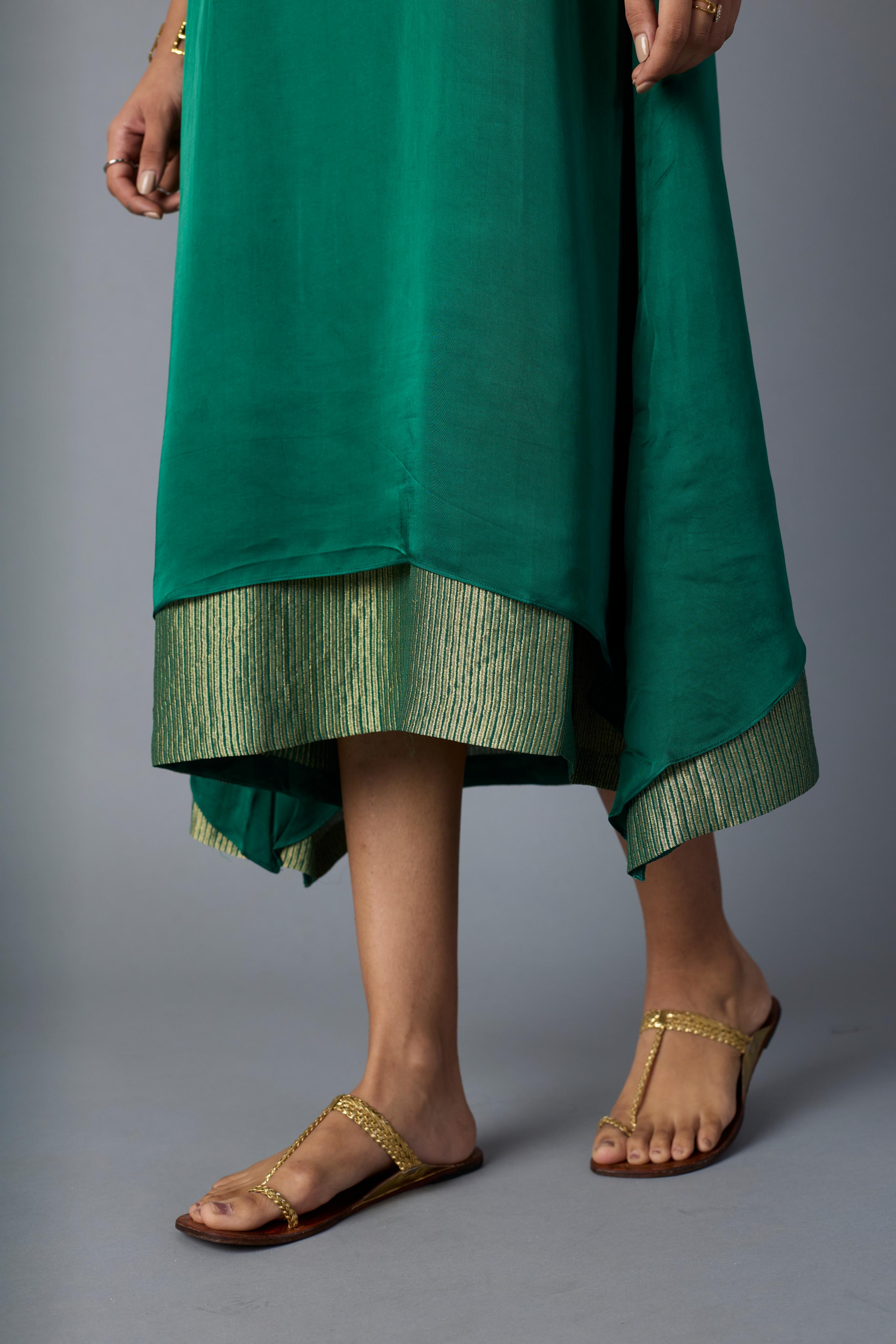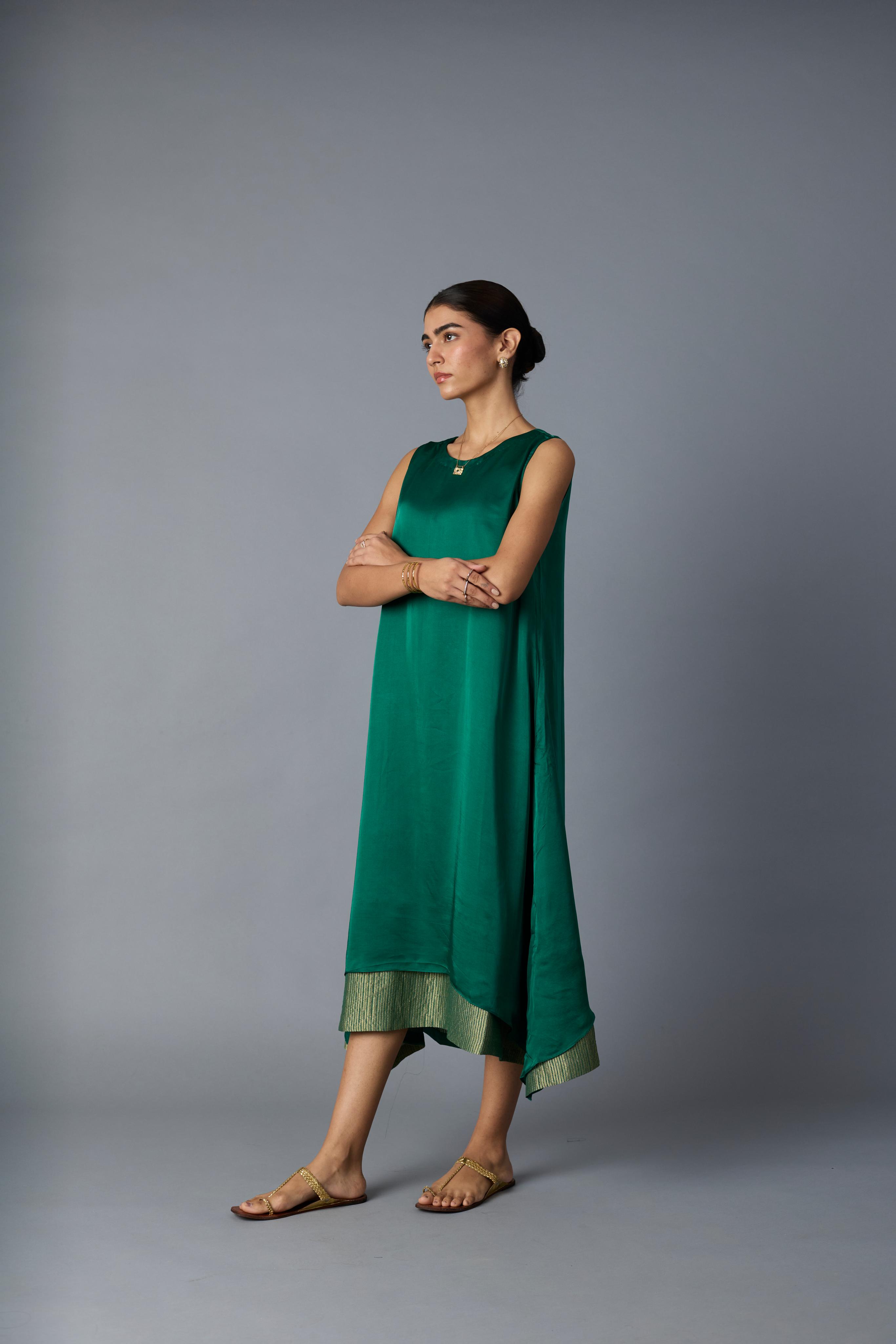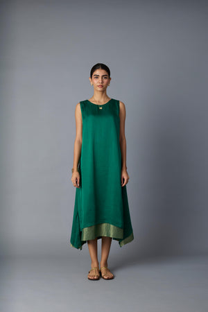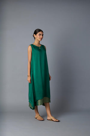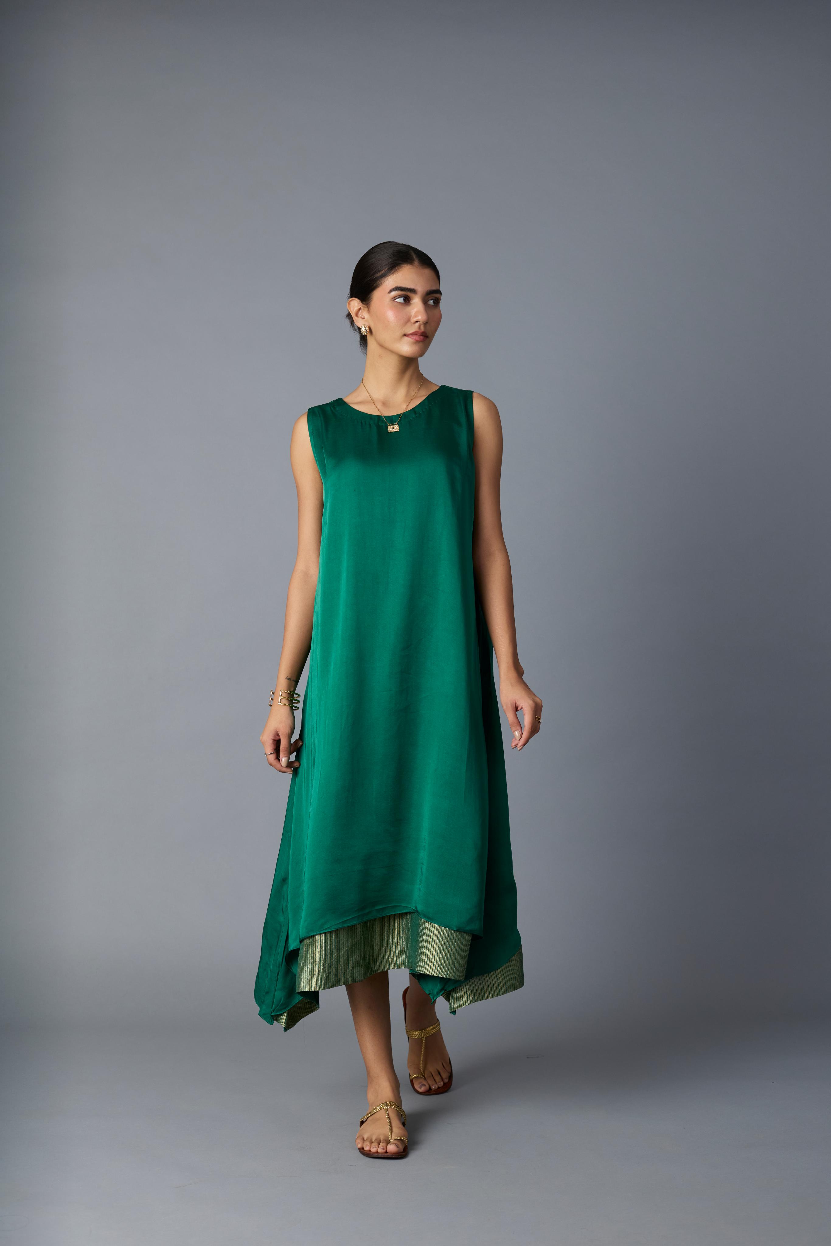 Halter neck dress with an under layer of zari stripes and key hole details at the back.