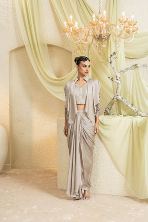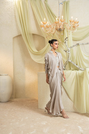 Cut in a satin blend with a refined lustre, this drape set skims the frame with an elongated, fluid line. A wrapped bodice with soft ruching and an asymmetric cascade creates quiet drama. In Champagne Mist, it feels modern and opulent, engineered for all-evening ease at weddings and celebrations.