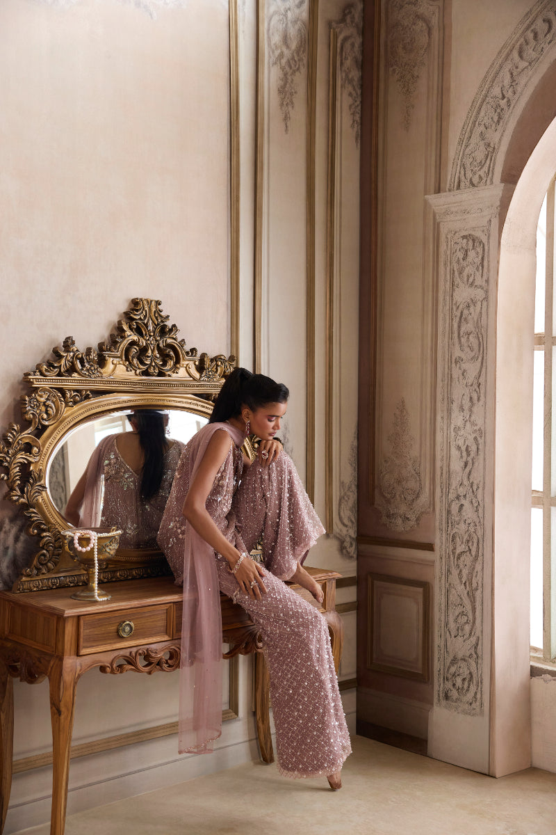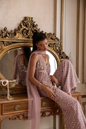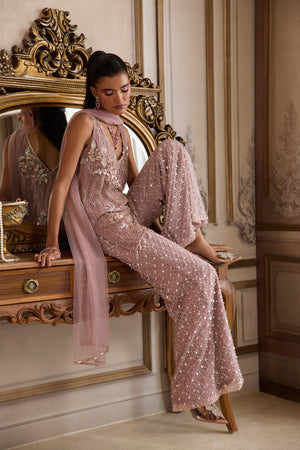 Champagne rose kurta and pants set featuring intricate hand embroidery with sequins, beads and cut dana . The V-neck short kurta is adorned with floral and leaf motif complimented by fully embroidered checks and hanging sequin sharara and soft net dupatta with delicate edging and cheetah all over.