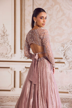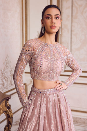 Champagne pure silk tissue lehenga with full sleeves hand embroidered blouse . The embroidery is a perfect blend of traditional and contemporary detailing. The lehenga has a scalloped border which features floral motifs and geometric patterns with cut dana, sequins, beads, mirrors .The lehenga makes a statement with pocket detailing on both sides. The lehenga is paired with a matching net dupatta with statement tassels at the palla.