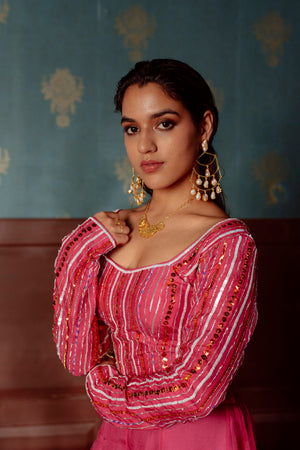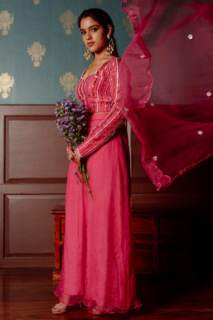 Pure Silk Blouse With Stones And Sequins Ebroidery On Front And Sleeves Paired With Silk Organza Dupatta Having Cut Work Embroidery And Sequins Flowers