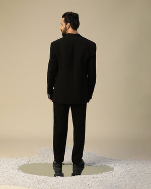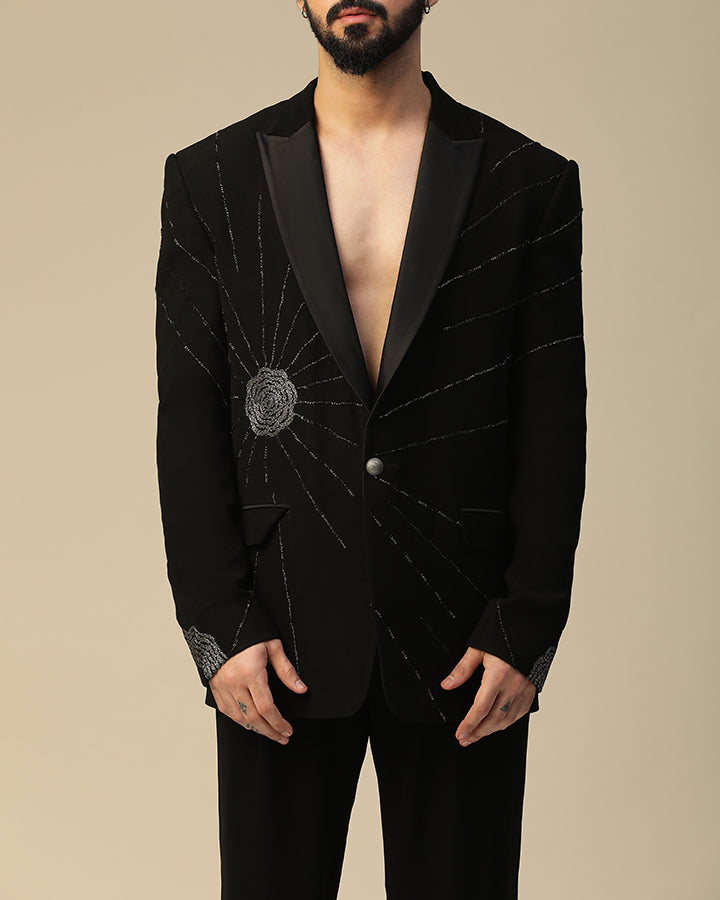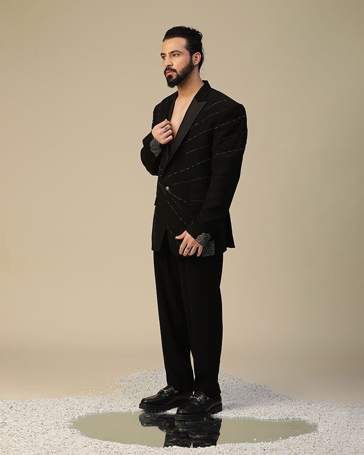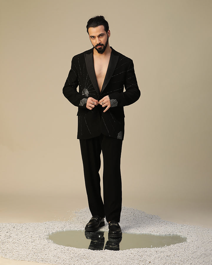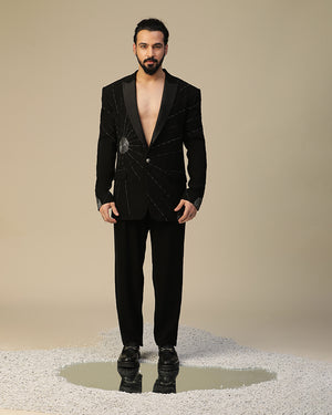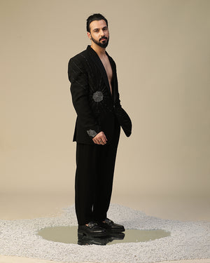 moonscatter suit set in imported italian fabric and with moti,dori,cutdaana hand work on suit and bow. It is paired same pants.