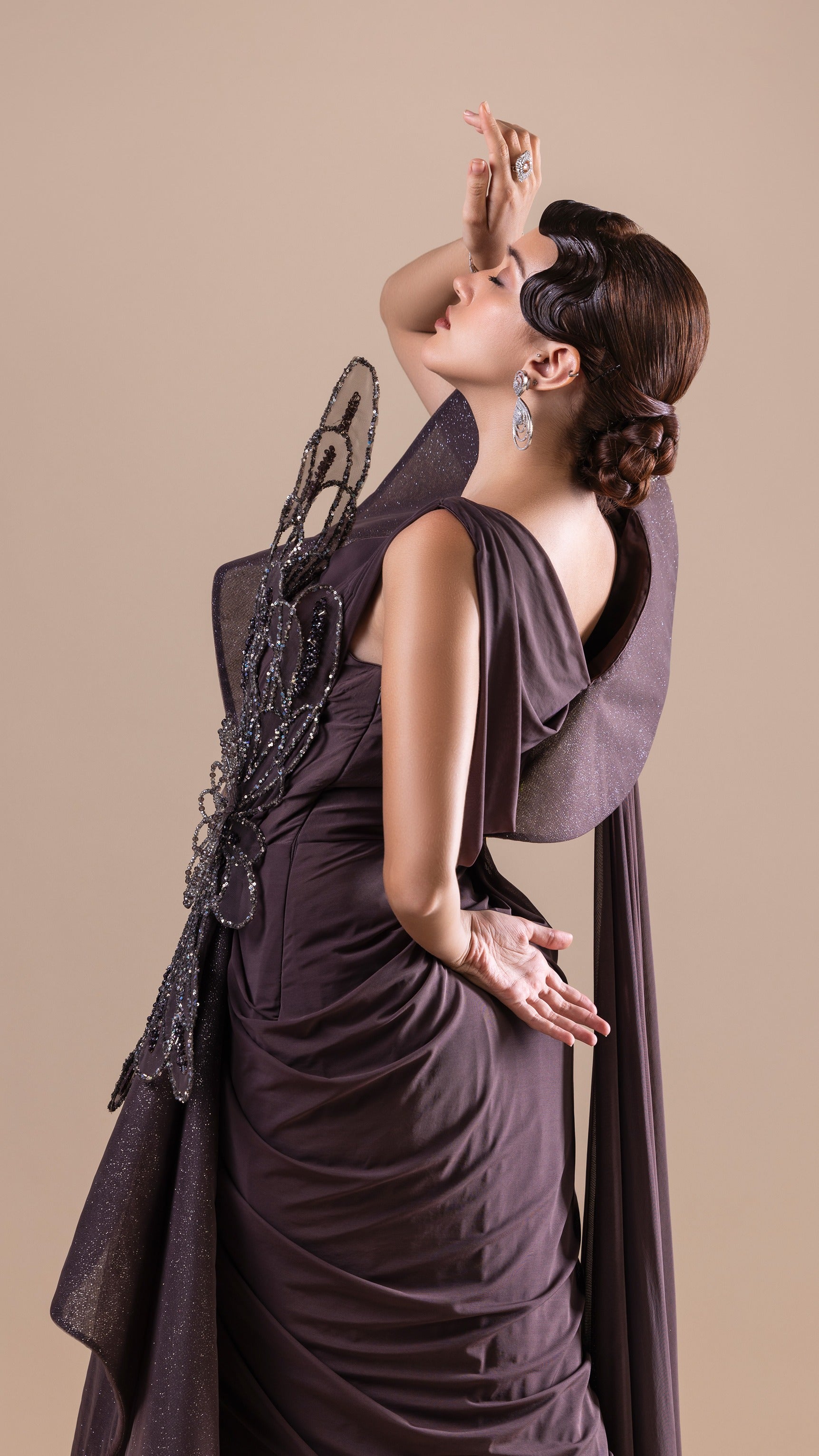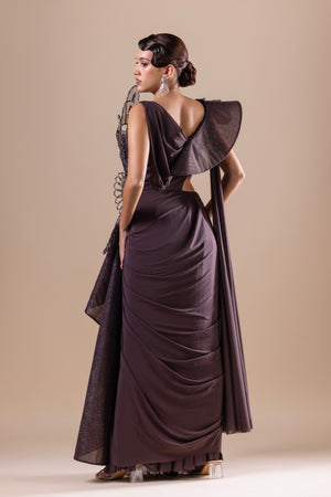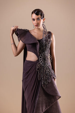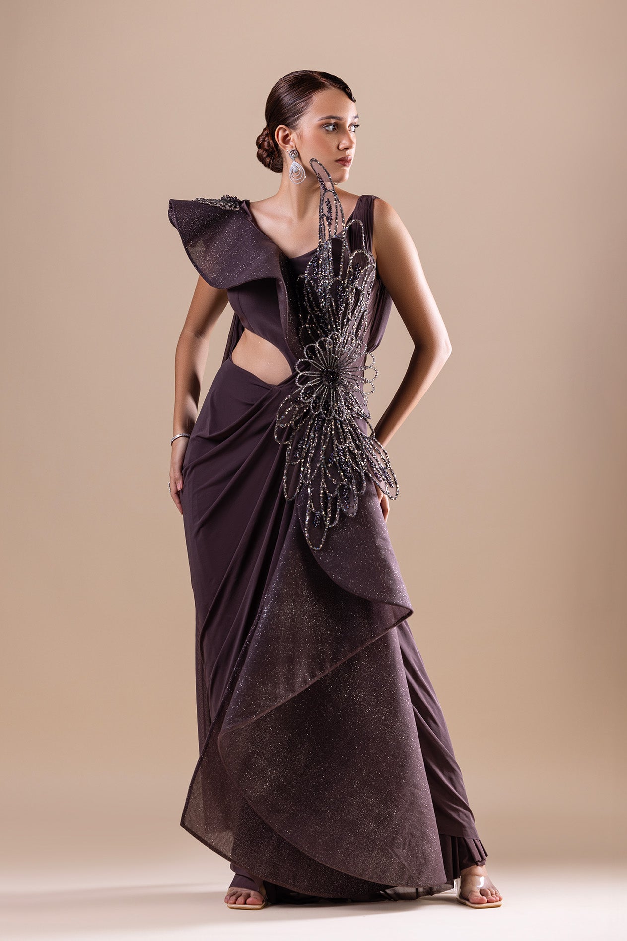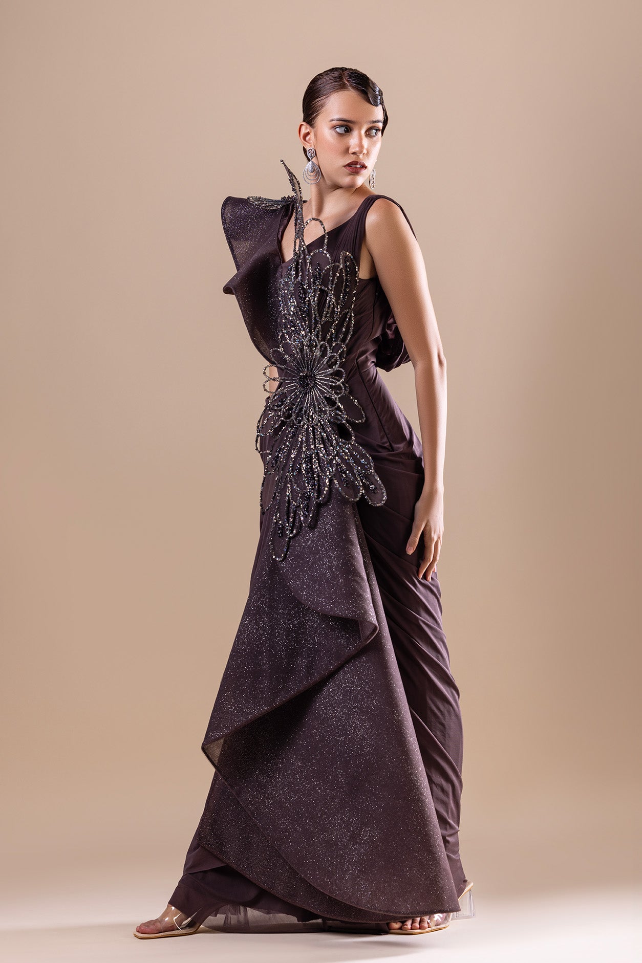 Charcol Grey lycra & Hard Net draped saree gown with crystals, cut dana and sequins hand embroidery.
