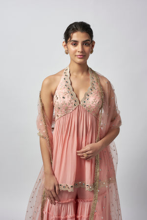 This delightful outfit features a halter neck kurta with intricate embroidery and mirror work, creating a soft yet striking appeal. Paired with tiered sharara with embroidered details and mirror embellishments at the hem. Completing the look is a net dupatta, delicately dotted with sequins and bordered with shimmering accents.