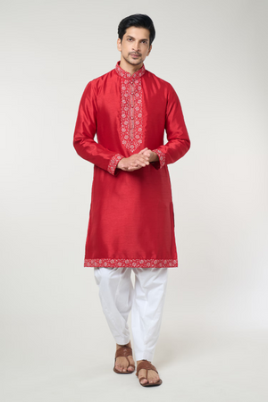 Cherry Red cotton silk based kurta, enhanced with floral thread and sequin emroidery, paired with an off white cotton based pathani pants.