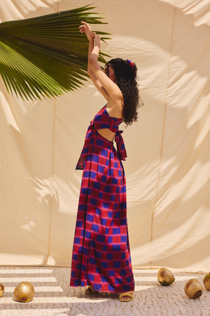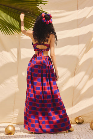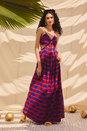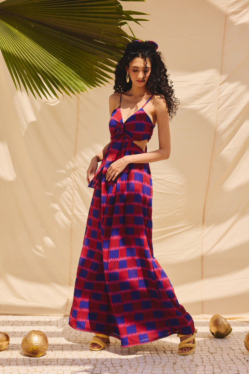 This long dress features thin straps and a deep neckline, creating a sleek and elegant look.