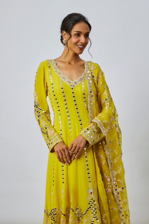 Featuring a kurta intricately adorned with mirror work and delicate embroidery, creating a luminous appeal. Paired with wide-legged palazzo pants showcasing detailed embellishments. Dupatta with scattered mirror work and intricate designs, enhances the outfit's overall grace.