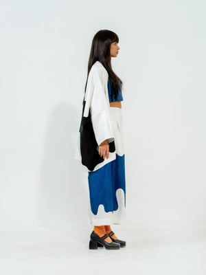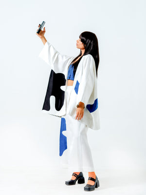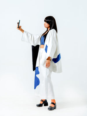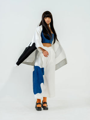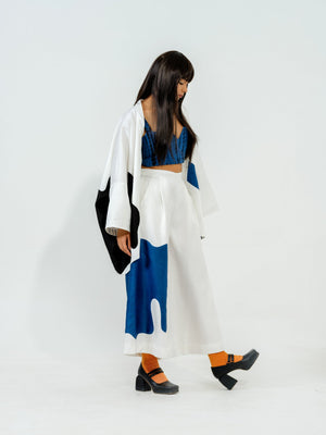 Relaxed flared pants with appliqué in satin linen sewn meticulously, two cross pockets and an elasticated waistband for ease of wearing.