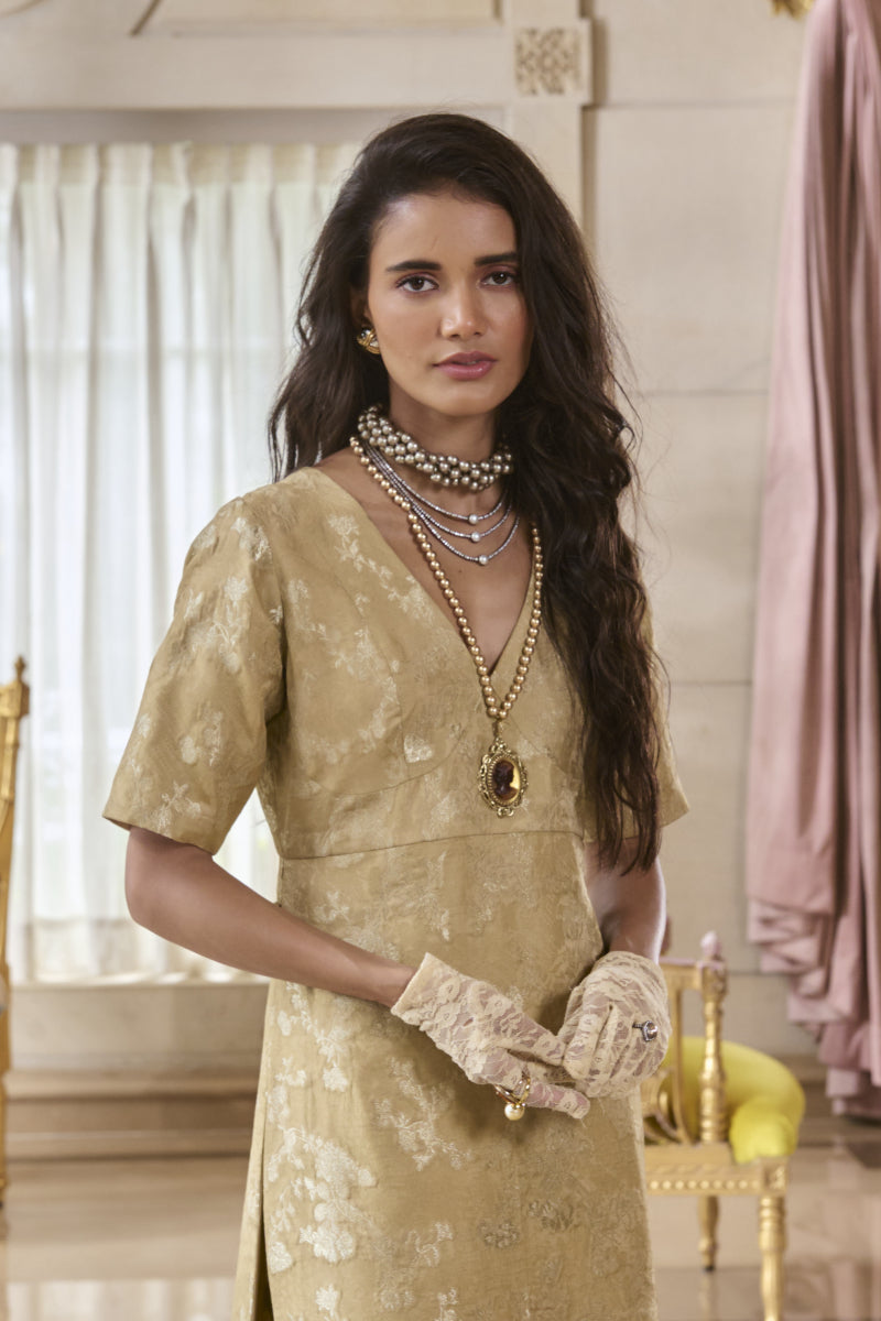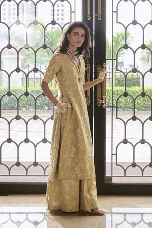 Exude timeless grace in this classic jacquard kurta and palazzo set, featuring a refined side slit and button detailing that add a tailored edge. Paired with a beautifully hand-embroidered dupatta, this ensemble brings together rich texture and subtle elegance radiating a royal charm with a contemporary silhouette.