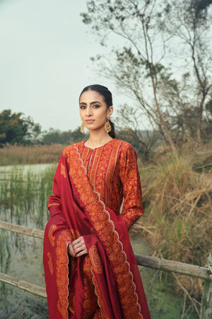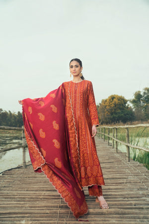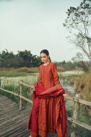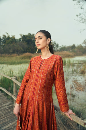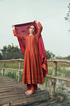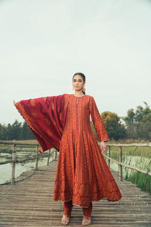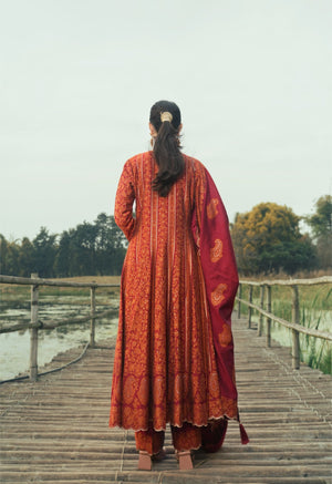 Introducing the Gulnare Anarkali, a symbol of timeless elegance and refined grace. Crafted from luxurious vegan silk in a deep shade of red, this Anarkali features exquisite woven Chikankari design, adding a touch of traditional charm to its contemporary design. The intricate threadwork and delicate motifs create a mesmerizing visual appeal, making it a perfect choice for special occasions. Whether it's a wedding celebration or a festive gathering, the Gulnare Anarkali exudes sophistication and poise.