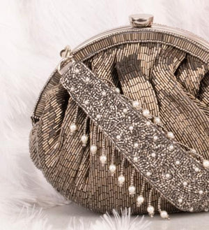 A chic yet stand out piece dressed with glitzy pewter work that comes together with a pearly finish in the handle.