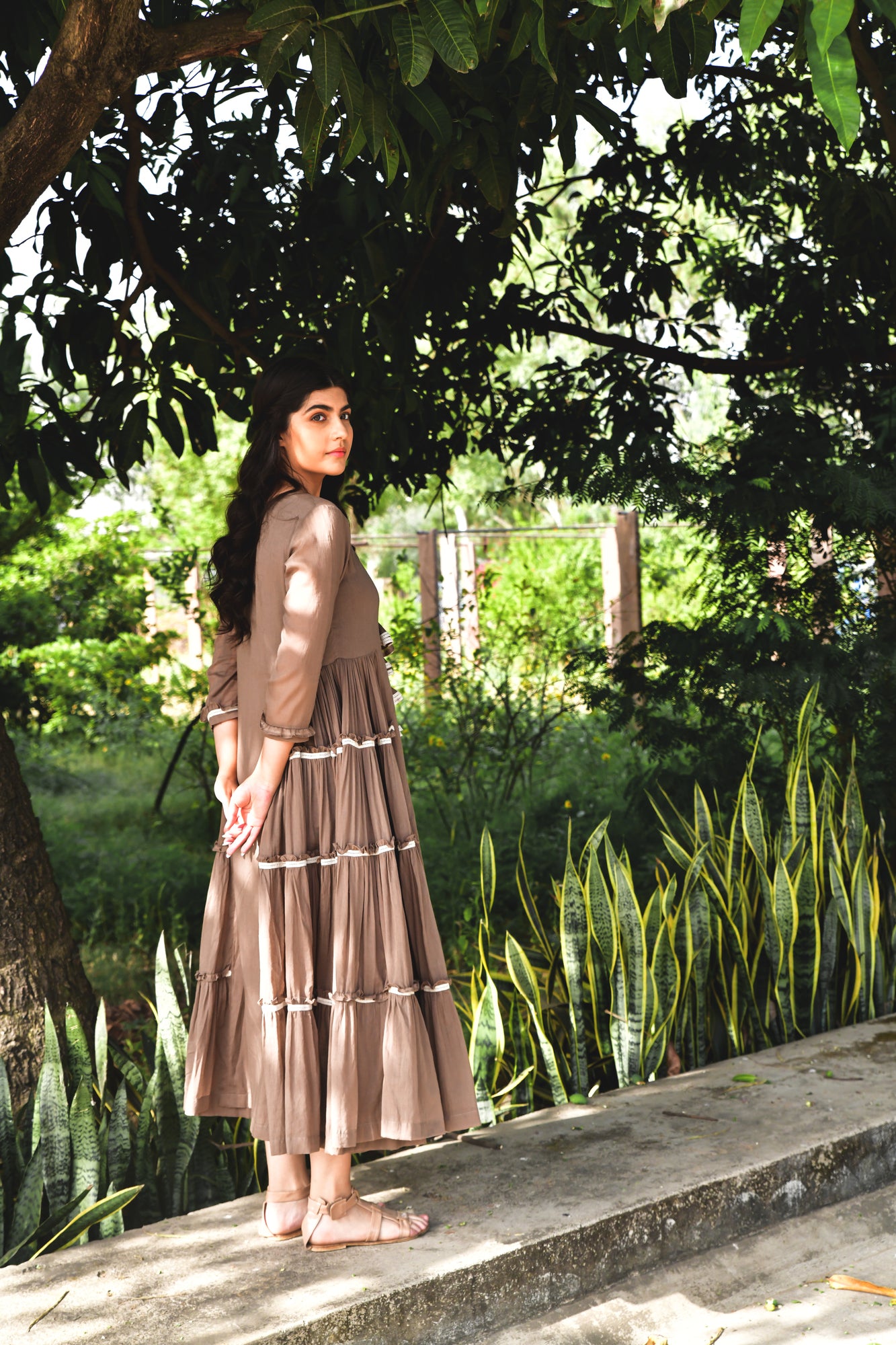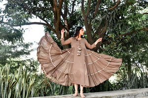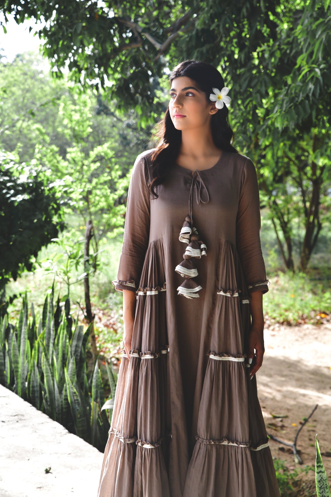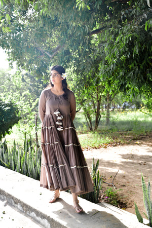 Give your casual wardrobe a stylish lift with this choco brown side tiered dress. Fashioned using mul cotton fabric, this dress will not fail to catch your fancy at a single glance.
