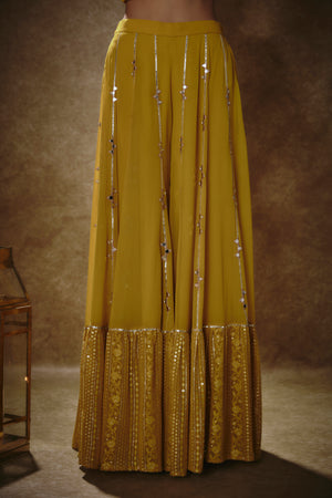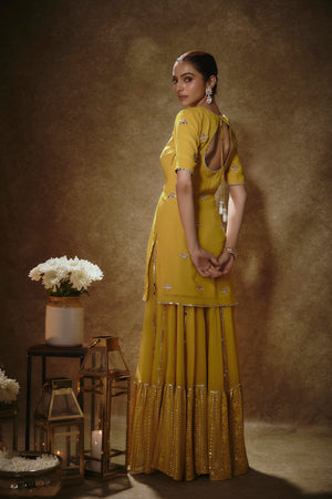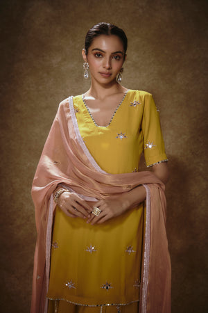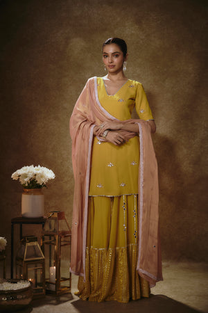 This Look Features A Citrine Yellow Kurta Sharara Set. The Sharara Has Lines Of Gota And Mirror Work Buttis Descending Into Sequin & Zari Embroidered Border. Teamed With An Elbow Sleeves Kurta With Pearl, Zari And Mirror Buttis. A Contrast Pink Shimmer Tissue Dupatta With Matching Buttis And Border Completes The Look.