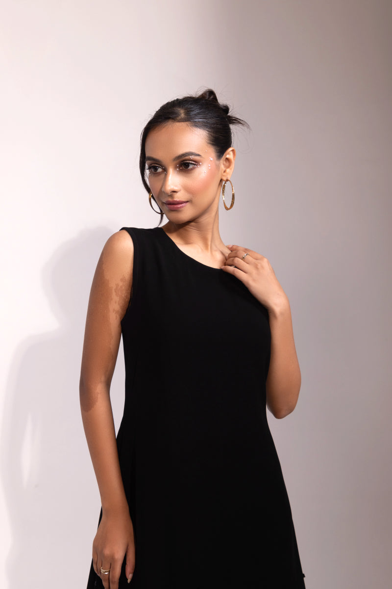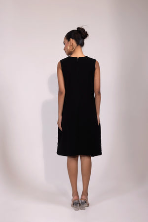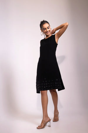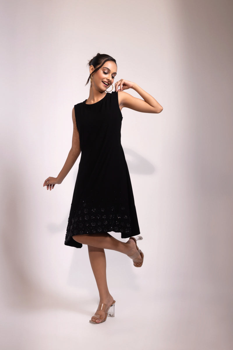 The outfit is a sleeveless black dress with a classic A-line silhouette. The hemline is adorned with a delicate, embroidered/beaded floral pattern, adding a subtle touch of embellishment and texture to the otherwise simple design.