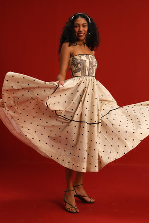 This Vintage Toile & Polka Strapless Midi Dress is a showstopper for every fashion-forward wardrobe. The bodice features an intricate vintage toile print, while the voluminous flared skirt contrasts with playful micro black polka dots on a warm ivory base. The strapless neckline and fitted bodice enhance the feminine silhouette, while the midi-length skirt brings movement and grace to every step. Ideal for garden parties, festive soirées, or weekend outings.