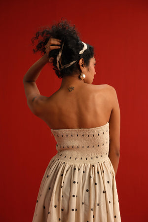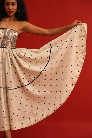 Color: Ivory base with black polka dots and vintage brown-toned bodice