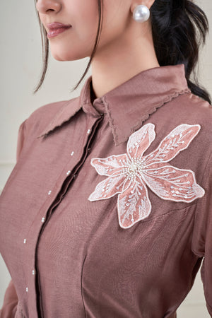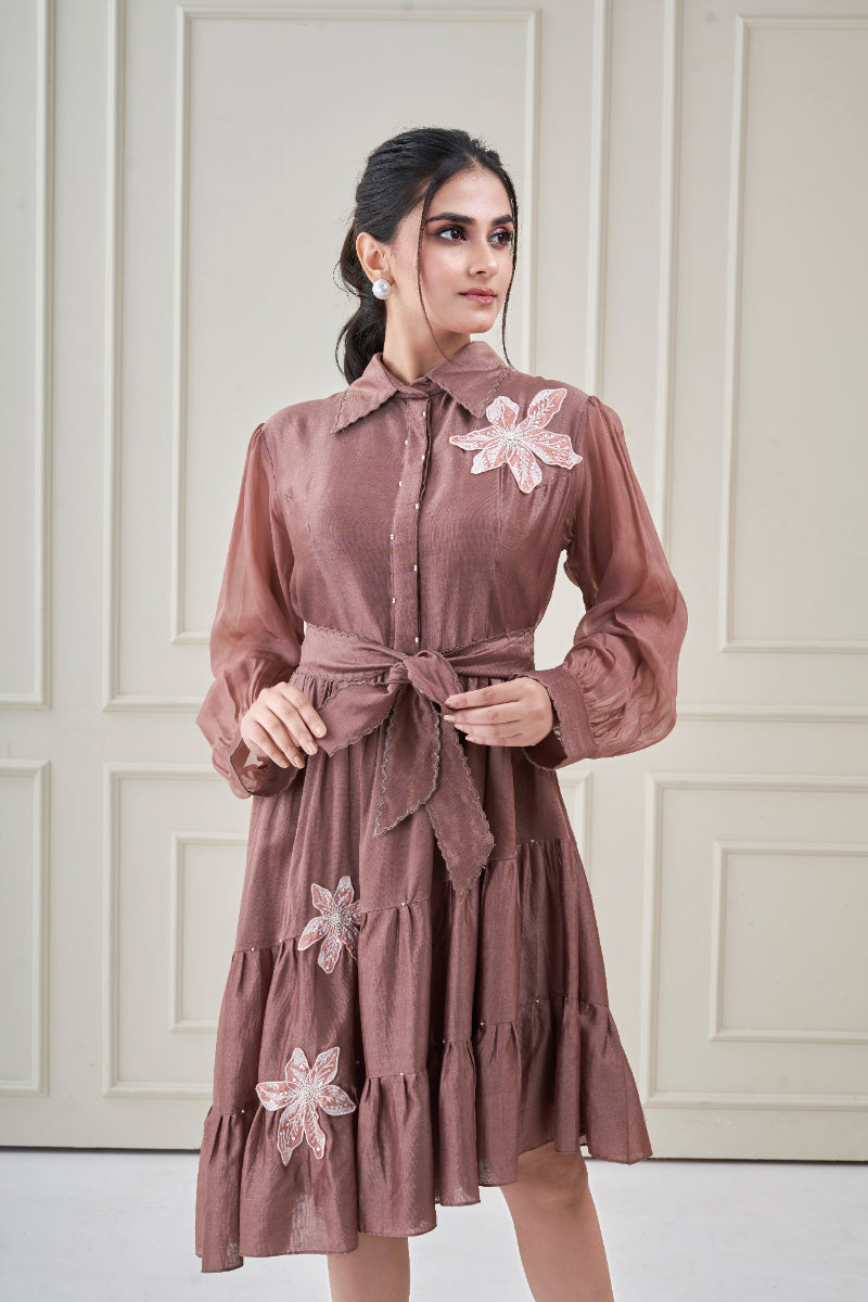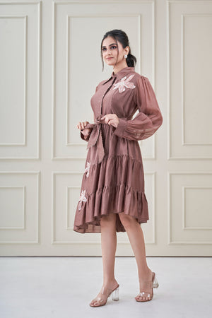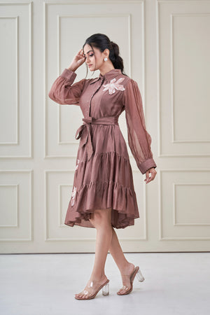 A clay dress featuring bold floral appliqué embroidery, a gathered tiered dress with an asymmetric hemline. Feminine, flowy, and effortlessly stylish — made for days that need gentle drama.