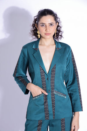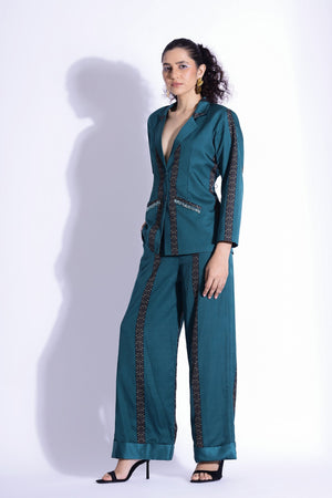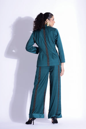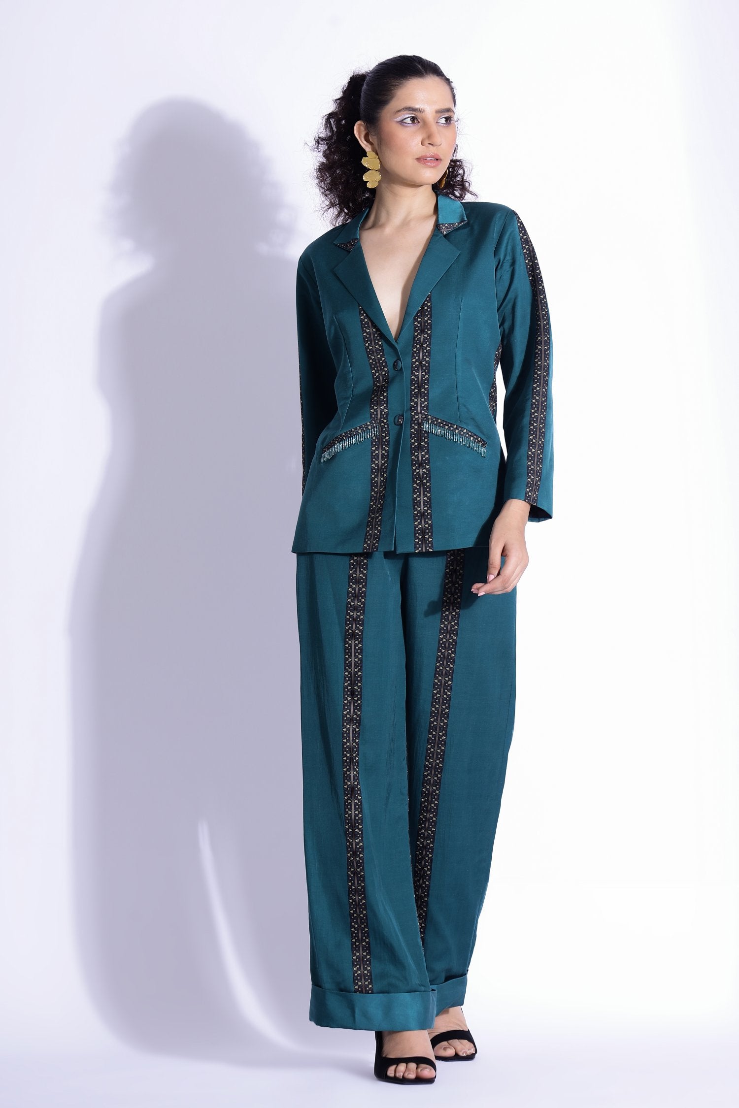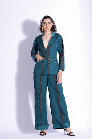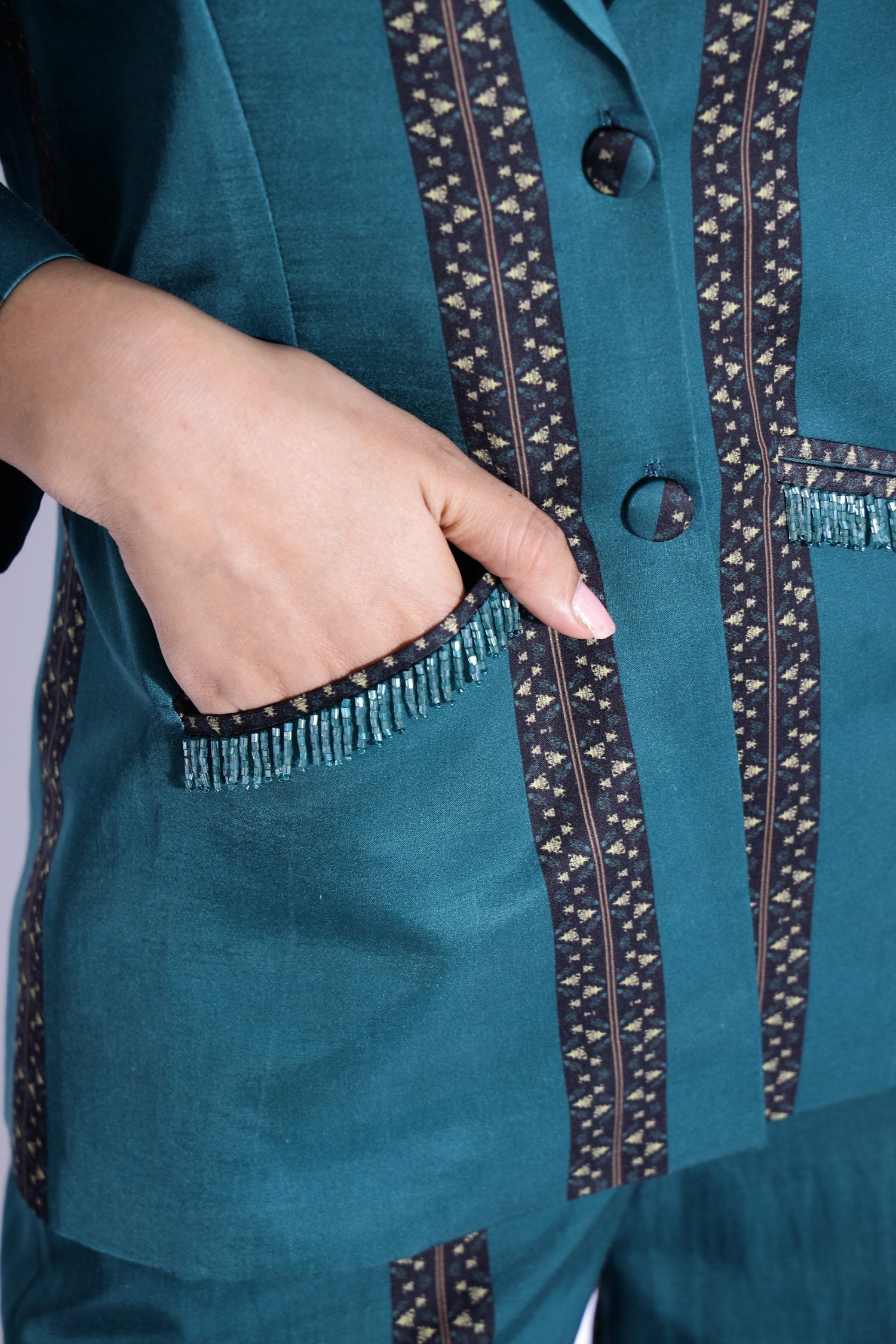 Featuring A Digitally Printed Cotton Silk Close Fit Darted Jacket With Embellished Pocket Paired With A Straight Pants With Folded Hem.