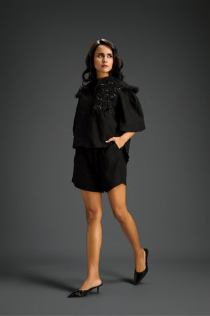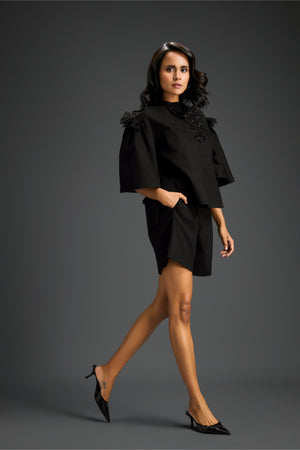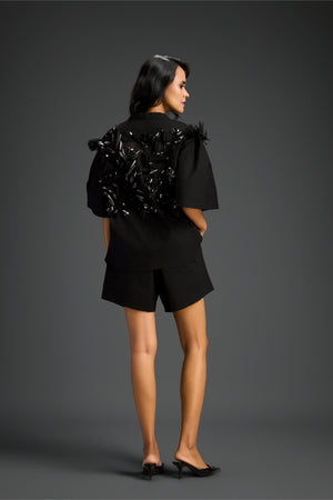 Structured Black Coord Set With Sheer Back With 3D Florals And Glossy Leaf Embellishments.